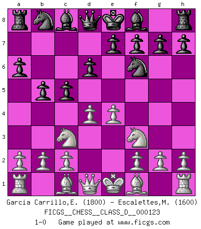 Last move : 1-0 2009 August 11 1:1:23 [Event "FICGS__CHESS__CLASS_D__000123"] [Site "FICGS"] [Date "2009.06.01"] [Round "1"] [White "Garcia Carrillo,Exal"] [Black "Escalettes,Maurice"] [Result "1-0"] [WhiteElo "1800"] [BlackElo "1600"] 1.e4 c5 2.Nf3 d6 3.Nc3 a6 4.Be2 b5 5.Bf1 Nf6 6.d4 1-0 This chess game has been lost on time (started : 2009.06.01 11:47:6) Sicilian Player White won this chess game. Follow this game move after move (download)I'm not afraid of Spassky. The world knows I'm the best. You don't need a match to prove it. (Bobby Fischer) Ich weiss nicht was Gott gegen mich auf 1.e4 antworten würde. (Robert James Fischer) Aunque la mayoría de la gente disfruta observar las partidas de los grandes Maestros de ataque, algunos de los jugadores mas notables en la historia han sido los jugadores silenciosos posicionales. Lentamente ellos te aplastan despojandote de tu espacio, congestionando tus piezas y dejandote virtualmente sin nada que hacer. (Yasser Seirawan) Avant la finale, les dieux ont créé le milieu de partie. (Tarrasch) There will be no order, only chaos. (Sol Robeson in Pi by Darren Aronofsky)