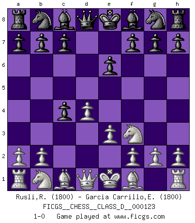 Last move : 1-0 2009 July 13 10:25:8 [Event "FICGS__CHESS__CLASS_D__000123"] [Site "FICGS"] [Date "2009.06.01"] [Round "1"] [White "Rusli,Rafnizar"] [Black "Garcia Carrillo,Exal"] [Result "1-0"] [WhiteElo "1800"] [BlackElo "1800"] 1.d4 d5 2.c4 e6 3.Nf3 dxc4 4.e3 1-0 This chess game has been lost on time (started : 2009.06.01 11:47:6) Queen's gambit declined Player White won this chess game. Follow this game move after move (download)Don't even mention losing to me. I can't stand to think of it. (Bobby Fischer) Rauchen ist dem Schachspieler bei seiner Arbeit, also im Wettkampf, untersagt. (Viktor Kortschnoi) Si el ingenio solamente fuese necesario para lucirse, las mujeres serían las mejores jugadoras de Ajedrez del mundo. (Albin) Seul un grand joueur sait à quel point il joue faiblement. (Xavier Tartacover) Men never do evil so completely and cheerfully as when they do it from religious conviction. (Blaise Pascal)