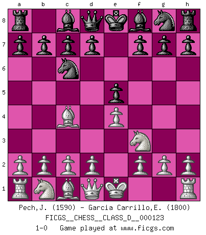 Last move : 1-0 2009 July 22 23:15:14 [Event "FICGS__CHESS__CLASS_D__000123"] [Site "FICGS"] [Date "2009.06.01"] [Round "1"] [White "Pech,Jaroslav"] [Black "Garcia Carrillo,Exal"] [Result "1-0"] [WhiteElo "1590"] [BlackElo "1800"] 1.e4 e5 2.Nf3 Nc6 3.Bc4 1-0 This chess game has been lost on time (started : 2009.06.01 11:47:6) King's pawn game Player White won this chess game. Follow this game move after move (download)Chess is the gymnasium of the mind. (Blaise Pascal) Jeder Schachmeister war einmal ein Anfänger. (Irving Chernev) La señal de un Gran Maestro es su habilidad de ganar una partida rápidamente y sin dolor. (Irving Chernev) La solitude du joueur d'Echecs à l'approche du mat est semblable à celle du condamné. (Francis Szpiner) Strategy without tactics is the slowest route to victory. Tactics without strategy is the noise before defeat. (Sun Tzu)