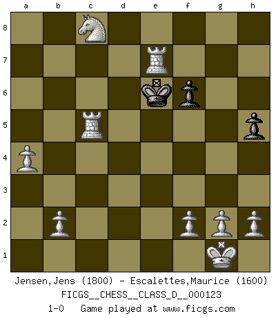 Last move : 1-0 2009 June 4 21:19:5 [Event "FICGS__CHESS__CLASS_D__000123"] [Site "FICGS"] [Date "2009.06.01"] [Round "1"] [White "Jensen,Jens"] [Black "Escalettes,Maurice"] [Result "1-0"] [WhiteElo "1800"] [BlackElo "1600"] 1.e4 c5 2.Nf3 d6 3.d4 cxd4 4.Nxd4 Nf6 5.Nc3 a6 6.Be3 e5 7.Nb3 b5 8.a4 b4 9.Nd5 Nbd7 10.Bc4 Nxe4 11.Qf3 Nef6 12.Nxf6+ Qxf6 13.Qxa8 Qd8 14.Na5 Be7 15.Nc6 Qc7 16.Bxa6 O-O 17.Nxe7+ Kh8 18.Bxc8 h6 19.Qb7 Rxc8 20.Qxc8+ Qxc8 21.Nxc8 d5 22.Rd1 d4 23.Bxd4 exd4 24.Rxd4 b3 25.Rxd7 bxc2 26.O-O f6 27.Rc1 Kh7 28.Rxc2 Kg6 29.R2c7 Kf5 30.Rxg7 h5 31.Rc5+ Ke6 32.Re7+ 1-0 Sicilian : Najdorf, Byrne (English) attack Kingside Castling by player Black (move 16) Kingside Castling by player White (move 26) Player White won this chess game. Follow this game move after move (download)It is difficult to play against Einstein's theory --on his first loss to Fischer. (Mikhail Tal) Wenn man heute mit 14 Jahren noch kein GM ist, kann man es vergessen. (Viswanathan Anand) Te sientas frente a un tablero y repentinamente tu corazón brinca. Tu mano tiembla al tomar una pieza y moverla. Pero lo que el Ajedrez te enseña es que tu debes permanecer ahí con calma y pensar de que si realmente es una buena idea o de que si hay otras ideas mejores. (Stanley Kubrick) Les Echecs ne sont pas pour les âmes timides. Ils requièrent un homme entier, qui ne s'arrête pas aveuglément à ce qui a été déjà établi, mais qui tente individuellement de sonder les profondeurs du jeu. (W. Steinitz) How many people work in NATO Headquarters ? - About half of them. (Dirk Stikker, NATO general secretary)