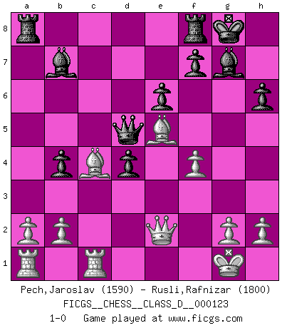 Last move : 1-0 2009 December 24 10:30:52 [Event "FICGS__CHESS__CLASS_D__000123"] [Site "FICGS"] [Date "2009.06.01"] [Round "1"] [White "Pech,Jaroslav"] [Black "Rusli,Rafnizar"] [Result "1-0"] [WhiteElo "1590"] [BlackElo "1800"] 1.d4 d5 2.c4 c6 3.Nf3 Nf6 4.Nc3 e6 5.e3 Nbd7 6.Bd3 dxc4 7.Bxc4 b5 8.Bd3 a6 9.e4 c5 10.e5 cxd4 11.Nxb5 axb5 12.exf6 Bb7 13.fxg7 Bxg7 14.O-O Qb6 15.Qe2 b4 16.Bf4 h6 17.Rfc1 O-O 18.Ne5 Nxe5 19.Bxe5 Qa5 20.f4 Qd5 21.Bc4 1-0 QGD Slav : 4.Nc3 Kingside Castling by player White (move 14) Kingside Castling by player Black (move 17) Player White won this chess game. Follow this game move after move (download)There's never before been a Chess player with such a thorough knowledge of the intricacies of the game and such an absolutely indomitable will to win. I think Bobby is the greatest player that ever lived. (Lisa Lane) Besser ein falscher Plan, logisch durchgeführt, als gar kein Plan. (Viktor Kortschnoi) Aquel que teme a un Peón de Reina aislado, debería de retirarse del Ajedrez. (Siegbert Tarrasch) Il n'y a plus de joueurs du niveau de Jacob Murray dont la seule quête est le beau jeu, le plaisir de voir les pièces construire quelque chose. Sur 10 idées à la minute, 9 seront sans intérêt, la dernière s'avèrera géniale. (Christian Bauer) History is a gallery of pictures in which there are few originals and many copies. (Alexis de Tocqueville)