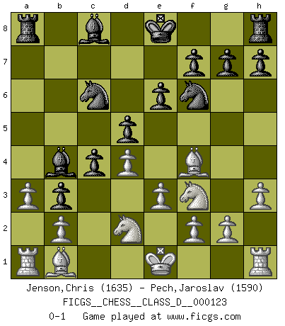 Last move : 0-1 2009 November 20 8:32:30 [Event "FICGS__CHESS__CLASS_D__000123"] [Site "FICGS"] [Date "2009.06.01"] [Round "1"] [White "Jenson,Chris"] [Black "Pech,Jaroslav"] [Result "0-1"] [WhiteElo "1635"] [BlackElo "1590"] 1.d4 Nf6 2.Bf4 d5 3.e3 c5 4.Nf3 Nc6 5.c3 e6 6.Bd3 Qb6 7.Qb3 c4 8.Qxb6 axb6 9.Bc2 b5 10.Nbd2 b4 11.h3 b3 12.Bb1 b5 13.a3 b4 14.cxb4 Bxb4 0-1 This chess game has been lost on time (started : 2009.06.01 11:47:6) Queen's pawn game Player Black won this chess game. Follow this game move after move (download)No price is too great for the scalp of the enemy King. (Koblentz) Im Internet Chess Club betrug mein Rating vorübergehend 3350 ELO-Punkte. (Sergej Karjakin) El Peón aislado arroja penumbra sobre todo el tablero. (Aaron Nimzovich) La vie est comme un jeu d'échecs : nous esquissons un plan, mais celui-ci est tributaire de ce que daignent faire l'adversaire aux échecs et le destin dans la vie. (Arthur Schopenhauer) What doesn't kill us makes us stronger. (Friedrich Nietzsche)