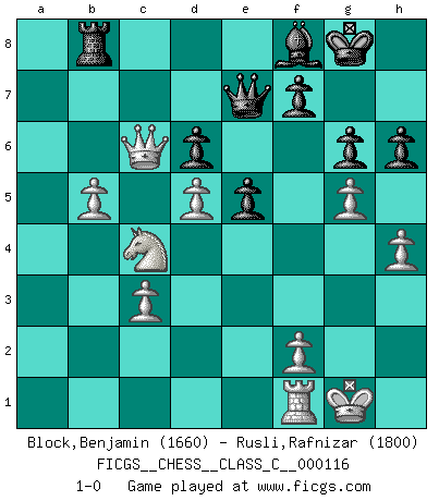 Last move : 1-0 2009 December 24 10:29:56 [Event "FICGS__CHESS__CLASS_C__000116"] [Site "FICGS"] [Date "2009.06.04"] [Round "1"] [White "Block,Benjamin"] [Black "Rusli,Rafnizar"] [Result "1-0"] [WhiteElo "1660"] [BlackElo "1800"] 1.e4 c5 2.Nf3 Nc6 3.d4 cxd4 4.Nxd4 e5 5.Nb5 d6 6.N1c3 a6 7.Na3 b5 8.Nd5 Nf6 9.Bg5 Be7 10.Bxf6 Bxf6 11.c3 Bg5 12.h4 Bh6 13.g4 g6 14.Nc2 Be6 15.a4 O-O 16.g5 Bg7 17.axb5 axb5 18.Bxb5 Rxa1 19.Qxa1 Ne7 20.Nce3 Nxd5 21.exd5 Bd7 22.Bxd7 Qxd7 23.Qa6 Rb8 24.Qc6 Qa7 25.O-O Qe7 26.Nc4 Bf8 27.b4 h6 28.b5 1-0 Sicilian : Labourdonnais-Loewenthal (Kalashnikov) variation Kingside Castling by player Black (move 15) Kingside Castling by player White (move 25) Player White won this chess game. Follow this game move after move (download)I won't play with you anymore. You have insulted my friend. - When an opponent cursed himself for a blunder. (Miguel Najdorf) Es tut gut, die Entwicklungsperiode von, [...] demokratischem Geist durchdringen zu lassen. Wie undemokratisch wäre es doch beispielsweise, den einen Offizier große Spaziertouren vornehmen zu lassen, während die anderen zu Hause säßen und sich entsetzlich langweilten. (Aaron Nimzowitsch) Aún el Rey más flojo huye despavorido ante la amenaza de un Jaque doble. (Aaron Nimzowitsch) Le moment que je préfère le plus dans une rencontre, c'est celui où je sens que la personnalité de l'adversaire se brise. (Robert Fischer) The obstacle is the path. (Zen proverb)