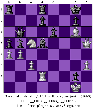 Last move : 1-0 2009 September 5 10:12:39 [Event "FICGS__CHESS__CLASS_C__000116"] [Site "FICGS"] [Date "2009.06.04"] [Round "1"] [White "Soszynski,Marek"] [Black "Block,Benjamin"] [Result "1-0"] [WhiteElo "1979"] [BlackElo "1660"] 1.e4 c5 2.d4 cxd4 3.Qxd4 Nc6 4.Qa4 e6 5.Nf3 Qb6 6.Bd3 Nf6 7.O-O Ng4 8.c3 Bc5 9.Qc2 Qc7 10.Nbd2 O-O 11.h3 Nge5 12.Be2 a6 13.Nxe5 Nxe5 14.Nb3 Ba7 15.Bg5 f6 16.Bc1 b5 17.Kh1 Nc4 18.a4 Bb7 19.Bd3 Rfd8 20.f4 Ne3 21.Bxe3 Bxe3 22.e5 fxe5 23.Bxh7+ Kh8 24.Qe2 Bxf4 25.Rxf4 exf4 26.Qh5 f3 27.Bg6 Kg8 28.Rd1 fxg2+ 29.Kg1 Qb6+ 30.Nc5 Bd5 31.b4 a5 32.Rd2 1-0 Sicilian : Smith-Morra gambit Kingside Castling by player White (move 7) Kingside Castling by player Black (move 10) Player White won this chess game. Follow this game move after move (download)For me, Chess is life and every game is like a new life. Every Chess player gets to live many lives in one lifetime. (Eduard Gufeld) Mein Name ist Rustam Kamsky. Sie haben meinen Sohn belästigt. Bereiten Sie sich aufs Sterben vor. (Rustam Kamsky) Me gusta decir que Bobby Fischer fue el mejor jugador que jamás haya existido. Pero lo que hizo de Fischer un genio, fue su habilidad de mezclar una frescura y pragmatismo Americano con ideas Rusas acerca de la estrategia. (Bruce Pandolfini) Des points faibles ou des trous dans la position de l'adversaire doivent être occupés par des pièces et non pas par des pions. (Siegbert Tarrasch) Chess is everything: art, science and sport. (Anatoly Karpov)