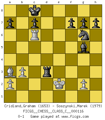 Last move : 0-1 2009 June 19 23:36:38 [Event "FICGS__CHESS__CLASS_C__000116"] [Site "FICGS"] [Date "2009.06.04"] [Round "1"] [White "Cridland,Graham"] [Black "Soszynski,Marek"] [Result "0-1"] [WhiteElo "1653"] [BlackElo "1979"] 1.e4 e5 2.Nf3 Nc6 3.Bb5 Nf6 4.O-O Nxe4 5.d4 Nd6 6.Bxc6 dxc6 7.dxe5 Nf5 8.Qxd8+ Kxd8 9.Nc3 Ne7 10.b3 Ng6 11.Bb2 Bg4 12.Rfe1 Ke8 13.Nd4 Rd8 14.Re4 Bc5 15.Nxc6 Rd2 16.Rxg4 Bxf2+ 17.Kf1 bxc6 18.Ne4 Rxc2 19.Ba3 Be3 20.Rg3 Bf4 21.Rc3 Rxc3 22.Nxc3 Bxh2 23.Rc1 Bxe5 24.Ne4 Kd7 25.Nc5+ Kc8 26.Nd3 Bf6 27.Rxc6 Rd8 28.Ke2 Re8+ 29.Kd2 Bg5+ 30.Kd1 Rd8 31.Ke2 Rxd3 0-1 Ruy Lopez : Berlin defense, Open variation Kingside Castling by player White (move 4) Player Black won this chess game. Follow this game move after move (download)Combinations have always been the most intriguing aspect of Chess. The masters look for them, the public applauds them, the critics praise them. It is because combinations are possible that Chess is more than a lifeless mathematical exercise. They are the poetry of the game; they are to Chess what melody is to music. They represent the triumph of mind over matter. (Reuben Fine) Strategie ist, wie man ein Mädchen auf den Rücksitz bekommt. Taktik ist, was man tut, wenn man dann dort ist. (Anonymous) Vive, pierde y aprende al observar a tu oponente como gana. (Amber Steenbock) Ce n'est pas pour s'amuser qu'il joue aux échecs : il célèbre un culte. (Vladimir Nabokov) Your best chance to get a Royal Flush in a casino is in the bathroom. (Anonymous)