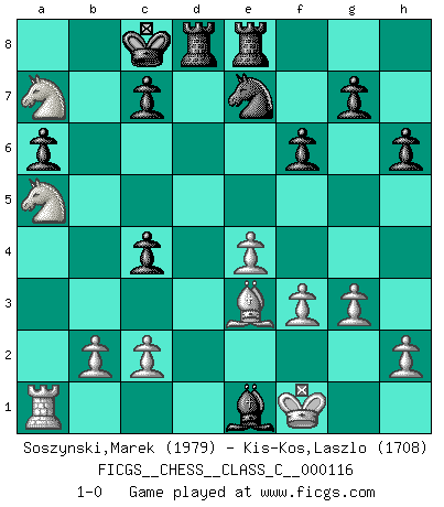 Last move : 1-0 2009 June 26 19:14:27 [Event "FICGS__CHESS__CLASS_C__000116"] [Site "FICGS"] [Date "2009.06.04"] [Round "1"] [White "Soszynski,Marek"] [Black "Kis-Kos,Laszlo"] [Result "1-0"] [WhiteElo "1979"] [BlackElo "1708"] 1.e4 e5 2.Nf3 Nc6 3.Bb5 a6 4.Bxc6 dxc6 5.O-O f6 6.d4 exd4 7.Nxd4 c5 8.Nb3 Qxd1 9.Rxd1 Bg4 10.f3 Bd7 11.Bf4 O-O-O 12.Nc3 c4 13.Na5 Bc5+ 14.Kf1 b5 15.a4 Ne7 16.axb5 Bxb5 17.Re1 Rhe8 18.Be3 Bb4 19.g3 h6 20.Nxb5 Bxe1 21.Na7+ 1-0 Ruy Lopez : Exchange, Gligoric variation Kingside Castling by player White (move 5) Queenside Castling by player Black (move 11) Player White won this chess game. Follow this game move after move (download)As one by one I mowed them down, my superiority soon became apparent. (Jose Capablanca) Frage des Reporters: -Worin besteht das Ziel von Gambiteröffnungen? Antwort: -Auf Kosten der Partie einen Ruf als Angriffspieler zu erwerben.- (Siegbert Tarrasch) Un jugador que es sorprendido, esta derrotado a medias. (Proverbio) Le succès, c'est être capable d'aller d'échec en échec sans perdre son enthousiasme. (Winston Churchill) Don't be discouraged. It's often the last key in the bunch that opens the lock. (Author unknown)