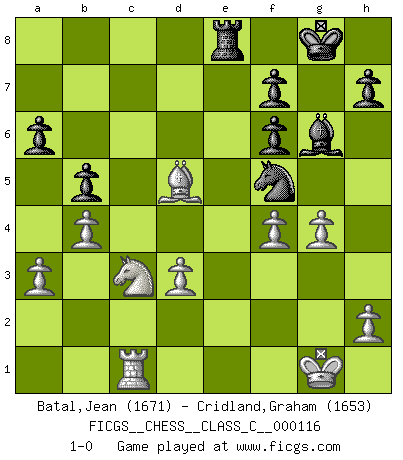 Last move : 1-0 2009 June 18 1:49:40 [Event "FICGS__CHESS__CLASS_C__000116"] [Site "FICGS"] [Date "2009.06.04"] [Round "1"] [White "Batal,Jean"] [Black "Cridland,Graham"] [Result "1-0"] [WhiteElo "1671"] [BlackElo "1653"] 1.c4 Nf6 2.Nc3 c6 3.e4 e5 4.Nge2 d5 5.exd5 cxd5 6.cxd5 Nxd5 7.Nxd5 Qxd5 8.Nc3 Qa5 9.Bc4 Bc5 10.O-O O-O 11.d3 Nc6 12.Be3 Bf5 13.Qf3 Bg6 14.a3 Bd4 15.b4 Qc7 16.Rac1 Qe7 17.Rfe1 a6 18.Bxd4 Nxd4 19.Qe3 Rae8 20.f4 b5 21.Bd5 Nf5 22.Qb6 Nh4 23.Rxe5 Qf6 24.Qxf6 gxf6 25.Rxe8 Rxe8 26.g3 Nf5 27.g4 1-0 English Opening Kingside Castling by player White (move 10) Kingside Castling by player Black (move 10) Player White won this chess game. Follow this game move after move (download)Chess is no whit inferior to the violin, and we have a large number of professional violinists. (Mikhail Botvinnik) Wie bekannt hörte Morphy 1859 auf, Schach zu spielen. Seine Enttäuschung galt nicht so sehr dem Schach, wie den Schachspielern. (Robert James Fischer) El Ajedrez es tan interesante por sí solo, que no es necesario un interés monetario para persuadir a una persona a que lo practique; por lo tanto, nunca se juega por dinero. (Benjamin Franklin) La conception d'un plan est le processus par lequel un joueur exploite les avantages de sa position tout en s'efforçant d'en réduire au minimum les inconvénients. Afin de garantir le succès, un plan doit toujours se fonder sur un diagnostic objectif des particularités d'une position. La conception d'un plan est d'autant plus difficile que la position est équilibrée, et grandement facilitée lorsqu'il n'existe qu'un seul plan susceptible de répondre aux exigences de la position. (Harry Golombek) Creativity involves breaking out of established patterns in order to look at things in a different way. (Edward De Bono)