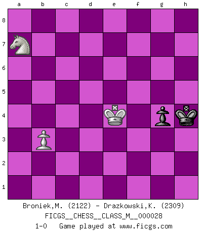 Last move : 1-0 2011 April 25 21:5:14 [Event "FICGS__CHESS__CLASS_M__000028"] [Site "FICGS"] [Date "2009.06.06"] [Round "1"] [White "Broniek,Mariusz Maciej"] [Black "Drazkowski,Krzysztof"] [Result "1-0"] [WhiteElo "2122"] [BlackElo "2309"] 1.e4 c5 2.Nf3 Nc6 3.d4 cxd4 4.Nxd4 Nf6 5.Nc3 e5 6.Ndb5 d6 7.Bg5 a6 8.Na3 b5 9.Bxf6 gxf6 10.Nd5 Bg7 11.Bd3 Ne7 12.Nxe7 Qxe7 13.O-O O-O 14.c4 f5 15.Qf3 d5 16.cxd5 fxe4 17.Bxe4 Rb8 18.Rfd1 Qh4 19.g3 Qg5 20.Qb3 Bg4 21.Rdc1 f5 22.Bg2 e4 23.Rc7 Rbd8 24.Nc2 Be2 25.Re1 Bc4 26.Qa3 Qg6 27.Ra7 Bxd5 28.Ne3 Be6 29.Rxa6 Qf7 30.Rd1 Rxd1+ 31.Nxd1 Rc8 32.Ra8 Qe8 33.Rxc8 Qxc8 34.b3 Bf8 35.Qb2 b4 36.Bf1 Kf7 37.Be2 Kg6 38.Qe5 Qd7 39.Ne3 Bd6 40.Qd4 Bf8 41.Qb6 Qd6 42.Qa7 f4 43.Ng2 f3 44.Nf4+ Kf6 45.Bb5 Bf5 46.h4 Qc5 47.Qa8 Kg7 48.Bc4 e3 49.Qxf3 exf2+ 50.Qxf2 Qe5 51.Nd3 Qf6 52.Qa7+ Be7 53.Nf4 Qe5 54.Kh2 Qc5 55.Qb7 Qf2+ 56.Ng2 Qc5 57.Qf3 Qe5 58.Bd3 Bd7 59.Qb7 Bg4 60.Nf4 h5 61.Be4 Kh6 62.Bf3 Bd6 63.Bxg4 hxg4 64.Qc8 Qb2+ 65.Ng2 Qd4 66.Qc4 Bc5 67.Qxd4 Bxd4 68.Nf4 Bc5 69.Kg2 Bd6 70.Kf2 Kg7 71.Ke3 Kf7 72.h5 Kf6 73.h6 Kf7 74.Ke4 Kf6 75.Nd3 Bxg3 76.Nxb4 Kg6 77.a4 Kxh6 78.a5 Kg5 79.a6 Bf2 80.Nc6 Kh4 81.a7 Bxa7 82.Nxa7 1-0 Sicilian : Pelikan (Lasker/Sveshnikov) variation Kingside Castling by player White (move 13) Kingside Castling by player Black (move 13) 10 pieces endgame at move 67 : White KNPPPP , Black KBPP WHITE : King + 1 Knight 4 Pawns BLACK : King + 1 Bishop 2 Pawns 9 pieces endgame at move 75 : White KNPPP , Black KBPP WHITE : King + 1 Knight 3 Pawns BLACK : King + 1 Bishop 2 Pawns 8 pieces endgame at move 76 : White KNPPP , Black KBP WHITE : King + 1 Knight 3 Pawns BLACK : King + 1 Bishop 1 Pawn 7 pieces endgame at move 77 : White KNPP , Black KBP WHITE : King + 1 Knight 2 Pawns BLACK : King + 1 Bishop 1 Pawn 6 pieces endgame at move 81 : White KNP , Black KBP WHITE : King + 1 Knight 1 Pawn BLACK : King + 1 Bishop 1 Pawn 5 pieces endgame at move 82 : White KNP , Black KP WHITE : King + 1 Knight 1 Pawn BLACK : King + 1 Pawn Player White won this chess game. Follow this game move after move (download)It was clear to me that the vulnerable point of the American Grandmaster (Bobby Fischer) was in double-edged, hanging, irrational positions, where he often failed to find a win even in a won position. (Efim Geller) Je mehr ich von der FIDE weiss, um so weniger verstehe ich. (Alexander Kalifman) ¿Quién es tu oponente esta tarde? Esta tarde mi oponente son las piezas negras. (Akiba Rubinstein) Aux échecs, les retours au sommet sont rares : les dommages psychologiques consécutifs à une défaite sont trop sévères. (Daily Telegraph) The leaves of memory seemed to make a mournful rustling in the dark. (Henry Wadsworth Longfellow)
