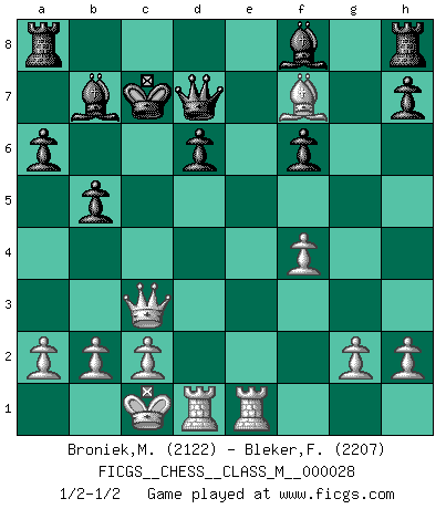Last move : 1/2-1/2 2009 July 29 16:37:38 [Event "FICGS__CHESS__CLASS_M__000028"] [Site "FICGS"] [Date "2009.06.06"] [Round "1"] [White "Broniek,Mariusz Maciej"] [Black "Bleker,Frits"] [Result "1/2-1/2"] [WhiteElo "2122"] [BlackElo "2207"] 1.e4 c5 2.Nf3 d6 3.d4 cxd4 4.Nxd4 Nf6 5.Nc3 a6 6.Bg5 e6 7.f4 Qc7 8.Qf3 Nbd7 9.O-O-O b5 10.Bd3 Bb7 11.Rhe1 Qb6 12.Nd5 exd5 13.Nc6 dxe4 14.Bxe4 Nc5 15.Bxf6 gxf6 16.Qh3 Ne6 17.Bg6 Kd7 18.Bxf7 Kxc6 19.Qxe6 Qd8 20.Qe3 Qd7 21.Qc3+ Kb6 22.Qd4+ Kc7 23.Qc3+ Kb6 24.Qd4+ Kc7 25.Qc3+ 1/2-1/2 Sicilian : Najdorf, 7.f4 Queenside Castling by player White (move 9) This chess game ended in a draw. Follow this game move after move (download)My God, Bobby Fischer plays so simply. (Alexei Suetin) Ich glaube, ich kenne inzwischen die Gründe für mein Versagen: schachliche Charakterfehler. Ich war nie ein Wunderkind und in meiner gesamten menschlichen Entwicklung immer zu langsam. (Viktor Kortschnoi) El juego de Fischer siempre fue nítido, racional y brillante. Uno de los mejores por siempre. (Dave Regis) Donnez-moi un Cavalier en 6e et je gagnerais toutes mes parties. (Steinitz) Hold em is to stud what chess is to checkers. (Johnny Moss)