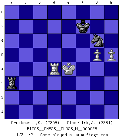 Last move : 1/2-1/2 2010 March 13 16:6:15 [Event "FICGS__CHESS__CLASS_M__000028"] [Site "FICGS"] [Date "2009.06.06"] [Round "1"] [White "Drazkowski,Krzysztof"] [Black "Simmelink,Joop"] [Result "1/2-1/2"] [WhiteElo "2309"] [BlackElo "2251"] 1.d4 d5 2.c4 c6 3.Nf3 Nf6 4.Nc3 e6 5.cxd5 exd5 6.Bg5 Be7 7.Qc2 g6 8.e3 Bf5 9.Bd3 Bxd3 10.Qxd3 Nbd7 11.O-O O-O 12.Rab1 a5 13.Rfc1 Re8 14.Qc2 Ne4 15.Bxe7 Qxe7 16.a3 Nd6 17.h3 f5 18.Na4 g5 19.Nc5 Nxc5 20.dxc5 Ne4 21.Nd4 Qf6 22.Qd1 Re7 23.b4 f4 24.Rc2 fxe3 25.fxe3 Rf7 26.b5 Nf2 27.Qe2 Raf8 28.bxc6 bxc6 29.Qf3 Qg6 30.Qg3 Ne4 31.Qe5 Rf6 32.Rb8 Rf1+ 33.Kh2 g4 34.Rxf8+ Kxf8 35.g3 Qf6 36.Qb8+ Kf7 37.Qc7+ Kf8 38.Qc8+ Kg7 39.Qxg4+ Kh6 40.Qe6 Qxe6 41.Nxe6 Rf6 42.Nf4 Kg5 43.Kg2 a4 44.Nd3 Re6 45.Kf3 Rf6+ 46.Nf4 Kf5 47.g4+ Ke5 48.h4 Rf8 49.g5 Kf5 50.Nd3 Ke6 51.Kg4 Rf1 52.Nf4+ Ke7 53.Rb2 Nxc5 54.Rb8 Nd7 55.Ra8 Kd6 56.Rxa4 Nb6 57.Ra7 Nc4 58.Ng2 c5 59.Rxh7 d4 60.exd4 cxd4 61.Rh6+ Ke7 62.Rf6 Rg1 63.Rf4 Rxg2+ 64.Kf3 Ra2 65.Re4+ Kf7 66.Rxd4 Ne5+ 67.Ke4 Ng6 68.h5 Rxa3 1/2-1/2 QGD Slav : 4.Nc3 Kingside Castling by player White (move 11) Kingside Castling by player Black (move 11) 10 pieces endgame at move 60 : White KRNPPP , Black KRNP WHITE : King + 1 Rook 1 Knight 3 Pawns BLACK : King + 1 Rook 1 Knight 1 Pawn 9 pieces endgame at move 63 : White KRPPP , Black KRNP WHITE : King + 1 Rook 3 Pawns BLACK : King + 1 Rook 1 Knight 1 Pawn 8 pieces endgame at move 66 : White KRPPP , Black KRN WHITE : King + 1 Rook 3 Pawns BLACK : King + 1 Rook 1 Knight 7 pieces endgame at move 68 : White KRPP , Black KRN WHITE : King + 1 Rook 2 Pawns BLACK : King + 1 Rook 1 Knight This chess game ended in a draw. Follow this game move after move (download)Methodical thinking is of more use in Chess than inspiration. (C. J. S. Purdy) Schach wird sich dank seiner hohen kulturellen Tradition immer durchsetzen. In näherer Zukunft womöglich sogar als Gegenreaktion auf die maßlose Reizüberflutung im Freizeit- und Spielbereich. (Garry Kasparov) La caracteristica mas importante en la posición del Ajedrez es la actividad de las piezas. Esto es absolutamente fundamental en todas las fases del juego: Apertura, Juego Medio y especialmente Finales. La limitación primordial en la actividad de una pieza, es la estructuración de los Peones. (Michael Stean) Les échecs sont plus proches de l'art de l'assassinat que de l'art de la guerre. (Arturo Perez-Reverte) Wawaweewa ! (Borat: Cultural learnings of America for make benefit glorious nation of Kazakhstan)