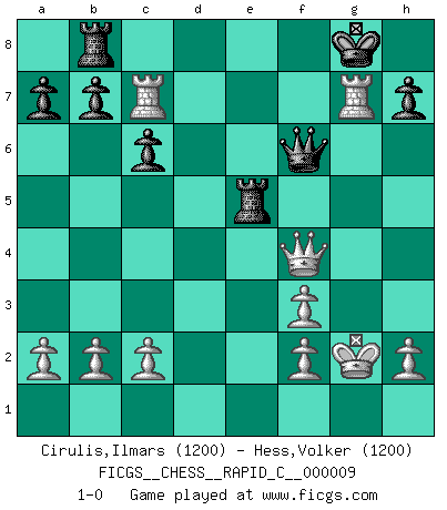 Last move : 1-0 2006 September 18 10:6:19 [Event "FICGS__CHESS__RAPID_C__000009"] [Site "FICGS"] [Date "2006.09.13"] [Round "1"] [White "Cirulis,Ilmars"] [Black "Hess,Volker"] [Result "1-0"] [WhiteElo "1200"] [BlackElo "1200"] 1.g4 e5 2.Nc3 d5 3.d4 exd4 4.Qxd4 Nf6 5.g5 Nc6 6.Qe3+ Ne4 7.Nxe4 dxe4 8.Qxe4+ Be7 9.Bf4 O-O 10.Rd1 Bd6 11.Nf3 Re8 12.Qc4 Be6 13.Qa4 Bg4 14.Bg2 Qe7 15.O-O Bxf3 16.Bxf3 Bxf4 17.Qxf4 Rab8 18.Rd5 Ne5 19.Rfd1 Nxf3+ 20.exf3 c6 21.Rd7 Qf8 22.Rc7 f6 23.R1d7 Re1+ 24.Kg2 Re5 25.gxf6 Qxf6 26.Rxg7+ 1-0 Grob's attack Kingside Castling by player Black (move 9) Kingside Castling by player White (move 15) Player White won this chess game. Follow this game move after move (download)Fischer is under obligation to nobody. (Joseph Platz) Ein bischen Romantik kann weder im Schach noch in der Liebe schaden. Also versuche ich mich ab und zu daran zu erinnern. (Nigel Short) Alekhine es un poeta que crea un trabajo de arte de algo que raramente inspiraría a otra persona a mandar una tarjeta postal. (Max Euwe) Shah mat. Le roi est mort. Cri de fierté d'un joueur venant de terrasser son adversaire, courtoisement, sans effusion de sang. A journey of a thousand sites begins with a single click. (Author unknown)