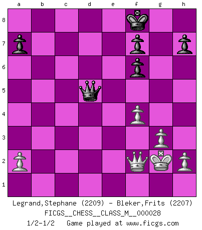 Last move : 1/2-1/2 2009 December 20 14:25:18 [Event "FICGS__CHESS__CLASS_M__000028"] [Site "FICGS"] [Date "2009.06.06"] [Round "1"] [White "Legrand,Stephane"] [Black "Bleker,Frits"] [Result "1/2-1/2"] [WhiteElo "2209"] [BlackElo "2207"] 1.d4 Nf6 2.c4 e6 3.Nf3 b6 4.g3 Ba6 5.b3 Bb4+ 6.Bd2 Be7 7.Bg2 c6 8.Bc3 d5 9.Ne5 Nfd7 10.Nxd7 Nxd7 11.Nd2 O-O 12.O-O Rc8 13.e4 c5 14.exd5 exd5 15.dxc5 dxc4 16.c6 cxb3 17.Re1 b2 18.Bxb2 Nc5 19.Ba3 Bf6 20.Bxc5 bxc5 21.Rc1 Bg5 22.f4 Bf6 23.Kh1 Bb5 24.Rxc5 Qb6 25.Ne4 Bxc6 26.Nxf6+ gxf6 27.Rxc6 Rxc6 28.Bxc6 Qxc6+ 29.Kg1 Qb6+ 30.Kg2 Rd8 31.Qg4+ Kf8 32.Re2 Qa5 33.Qf3 Rd2 34.Rxd2 Qxd2+ 35.Qf2 Qd5+ 36.Kg1 Qd1+ 37.Kg2 Qd5+ 1/2-1/2 Queen's Indian : Nimzovich variation (exaggerated Fianchetto) Kingside Castling by player Black (move 11) Kingside Castling by player White (move 12) This chess game ended in a draw. Follow this game move after move (download)There just isn't enough televised Chess. (David Letterman) Über Kasparov: Es ist offensichtlich, daß er in einem totalitären Staat aufwuchs und deshalb zu diktatorischen Zügen neigt. (Viktor Kortschnoi) ¿Porque tengo que perder ante este idiota?. (Aron Nimzovich) C'est une question de caractère, Beaucoup de gens perdent leur motivation très vite. D'autres, ils sont rares, peuvent la conserver très longtemps. J'aime les échecs, encore aujourd'hui je suis heureux d'analyser des parties. J'aime toujours gagner, je déteste encore perdre. Bien jouer est important pour mon intégrité intellectuelle et morale. Et puis les échecs vivent en ce moment une période historique grâce à Internet. Ils se développent dans les systèmes éducatifs à travers le monde. Ils sortent de leur ghetto, et c'est mon rôle de mener à bien cette révolution. (Gary Kasparov) Perception is reality. (Immanuel Kant)