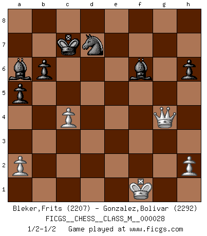 Last move : 1/2-1/2 2010 February 22 9:6:28 [Event "FICGS__CHESS__CLASS_M__000028"] [Site "FICGS"] [Date "2009.06.06"] [Round "1"] [White "Bleker,Frits"] [Black "Gonzalez,Bolivar"] [Result "1/2-1/2"] [WhiteElo "2207"] [BlackElo "2292"] 1.e4 c5 2.Nf3 d6 3.d4 cxd4 4.Nxd4 Nf6 5.Nc3 a6 6.Bg5 e6 7.f4 Qb6 8.Qd2 Qxb2 9.Rb1 Qa3 10.e5 h6 11.Bh4 dxe5 12.fxe5 g5 13.exf6 gxh4 14.Be2 Qa5 15.O-O Nd7 16.Rf4 h3 17.Qe3 Qe5 18.Ne4 hxg2 19.Nf5 exf5 20.Rxf5 Qxf5 21.Nd6+ Kd8 22.Nxf5 Bc5 23.Nd4 Re8 24.Qd3 Rxe2 25.Qxe2 Bxd4+ 26.Kxg2 Bxf6 27.Qh5 a5 28.Qxf7 Ra6 29.c4 Rd6 30.Re1 b6 31.Re6 Bb7+ 32.Kf1 Rxe6 33.Qxe6 Kc7 34.Qg4 Ba6 1/2-1/2 Sicilian : Najdorf, 7...Qb6 Kingside Castling by player White (move 15) This chess game ended in a draw. Follow this game move after move (download)Let the perfectionist play postal. (Yasser Seirawan) Wenn Capablanka heute auf der Schachbühne erscheinen würde, hätte er ein halbes Jahr gebraucht um sich die Schachtheorie anzueignen. Und dann hätte er alles und jeden besiegt. (Mikhail Moiseyevich Botvinik) No puedes jugar al Ajedrez si eres de corazón noble. (Proverbio Francés) Roi des jeux et jeu des rois, les échecs portent en eux un sentiment d'infini. Ils donnent à celui qui s'est efforcé d'en approfondir les arcanes l'impression de n'être pas à la mesure de l'homme; en fait, ils constituent un résumé de l'univers, un microcosme, et figurent cette grande échelle qui, dans les plans de la lumière descend jusqu'à la matière, qui des abîmes insondables remonte jusqu'en l'infini de Dieu. (Pyrame) Perfection is achieved, not when there is nothing more to add, but when there is nothing left to take away. (Antoine de Saint-Exupéry)