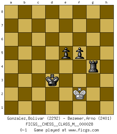 Last move : 0-1 2010 June 25 17:39:32 [Event "FICGS__CHESS__CLASS_M__000028"] [Site "FICGS"] [Date "2009.06.06"] [Round "1"] [White "Gonzalez,Bolivar"] [Black "Bezemer,Arno"] [Result "0-1"] [WhiteElo "2292"] [BlackElo "2401"] 1.e4 c5 2.Nf3 d6 3.d4 cxd4 4.Nxd4 Nf6 5.Nc3 a6 6.Bg5 Nbd7 7.Bc4 Qb6 8.Bb3 e6 9.f3 Be7 10.Be3 Nc5 11.Qd2 O-O 12.O-O-O Qc7 13.g4 b5 14.Kb1 b4 15.Na4 Bd7 16.Qxb4 Rfc8 17.g5 Ne8 18.Qa3 Bf8 19.Nxc5 dxc5 20.Ne2 c4 21.Rxd7 Qxd7 22.Ba4 Qb7 23.Qc3 Nd6 24.Ka1 Nb5 25.Qa5 Rab8 26.Bxb5 axb5 27.Kb1 b4 28.Rd1 Qc6 29.Qe5 Ra8 30.h4 Qa6 31.Nc1 b3 32.Qc3 bxa2+ 33.Ka1 Qa4 34.Rd2 Bb4 35.Qe5 Ra5 36.Qd4 Bxd2 37.Qxd2 c3 38.bxc3 Rb5 39.Nb3 Rxb3 40.cxb3 Qxb3 41.Qb2 Rxc3 42.Qxb3 Rxb3 43.Bc5 Rxf3 44.Kxa2 Rh3 45.Kb2 Rxh4 46.e5 Re4 47.Bd6 Rg4 48.Be7 h5 49.gxh6 gxh6 50.Kc3 h5 51.Kd3 h4 52.Bxh4 Rxh4 53.Ke3 Kg7 54.Kd3 Kg6 55.Ke3 Kf5 56.Kd3 Kxe5 57.Ke3 f5 58.Kf3 Kd4 59.Kg3 Rg4+ 60.Kf3 Kd3 61.Kf2 e5 0-1 Sicilian : Najdorf, 6.Bg5 Kingside Castling by player Black (move 11) Queenside Castling by player White (move 12) 10 pieces endgame at move 45 : White KBPP , Black KRPPPP WHITE : King + 1 Bishop 2 Pawns BLACK : King + 1 Rook 4 Pawns 9 pieces endgame at move 49 : White KBPP , Black KRPPP WHITE : King + 1 Bishop 2 Pawns BLACK : King + 1 Rook 3 Pawns 8 pieces endgame at move 49 : White KBP , Black KRPPP WHITE : King + 1 Bishop 1 Pawn BLACK : King + 1 Rook 3 Pawns 7 pieces endgame at move 52 : White KBP , Black KRPP WHITE : King + 1 Bishop 1 Pawn BLACK : King + 1 Rook 2 Pawns 6 pieces endgame at move 52 : White KP , Black KRPP WHITE : King + 1 Pawn BLACK : King + 1 Rook 2 Pawns 5 pieces endgame at move 56 : White K , Black KRPP WHITE : King + BLACK : King + 1 Rook 2 Pawns Player Black won this chess game. Follow this game move after move (download)Many Chess players were surprised when after the game, Fischer quietly explained: 'I had already analyzed this possibility' in a position which I thought was not possible to foresee from the opening. (Mikhail Tal) Die größte Kunst beim Schach besteht darin dem Gegner nicht zu zeigen was er tun kann. (Garry Kasparov) La maestría del Ajedrez consiste esencialmente en analizar posiciónes de Ajedrez con precisión. (Mikhail Botvinnik) Le jeu d'échecs est comme rejeté hors du temps. (Antoine de Saint-Exupéry) The ultimate in disposing one's troops is to be without ascertainable shape. Then the most penetrating spies cannot pry in nor can the wise lay plans against you. (Sun Tzu)