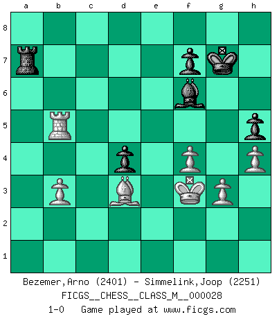 Last move : 1-0 2009 August 21 2:50:54 [Event "FICGS__CHESS__CLASS_M__000028"] [Site "FICGS"] [Date "2009.06.06"] [Round "1"] [White "Bezemer,Arno"] [Black "Simmelink,Joop"] [Result "1-0"] [WhiteElo "2401"] [BlackElo "2251"] 1.d4 d5 2.c4 c6 3.Nf3 Nf6 4.Nc3 e6 5.e3 Nbd7 6.Qc2 Bd6 7.Bd3 O-O 8.O-O dxc4 9.Bxc4 b5 10.Be2 Bb7 11.Rd1 Qc7 12.e4 e5 13.Bg5 exd4 14.Rxd4 Ne5 15.h3 Rad8 16.Nh4 b4 17.Bxf6 gxf6 18.Na4 c5 19.R4d1 Nc6 20.Nf5 Nd4 21.Nxd4 cxd4 22.Qxc7 Bxc7 23.Nc5 Ba8 24.Kf1 Bb6 25.Rac1 Rfe8 26.f3 f5 27.exf5 a5 28.Bd3 Re3 29.Na4 Ba7 30.b3 Kg7 31.Nb2 Bd5 32.Nc4 Bxc4 33.Rxc4 h5 34.h4 Rde8 35.Kf2 Bb6 36.Rc6 Bd8 37.g3 Bf6 38.Ra6 R3e5 39.f4 Rc5 40.Re1 Rec8 41.Bc4 R8c7 42.Re8 Rxf5 43.R6a8 Kh6 44.Rg8 Rfc5 45.Ra6 R5c6 46.Rga8 Rxa6 47.Rxa6 Kg7 48.Rxa5 Rd7 49.Bd3 Kh6 50.Ra6 Kg7 51.Rb6 Ra7 52.Rxb4 Rxa2+ 53.Kf3 Ra7 54.Rb5 1-0 QGD Slav : 4.Nc3 Kingside Castling by player Black (move 7) Kingside Castling by player White (move 8) Player White won this chess game. Follow this game move after move (download)It is the aim of the modern school, not to treat every position according to one general law, but according to the principle inherent in the position. (Richard Reti) Korrekt heißt in Deutschland die Haltung eines Mannes, dessen Benehmen nach dem Urteile seiner Nachbarn seiner Stellung angemessen ist. Um korrekt zu sein, muß man sich der Meinung der anderen anpassen... (Emanuel Lasker) Un Peón pasado es un criminal, quién debe ser mantenido bajo candado y llave. Leves medidas, tales como vigilancia policiaca, no son suficientes. (Aaron Nimzovich) Le moment que je préfère le plus dans une rencontre, c'est celui où je sens que la personnalité de l'adversaire se brise. (Robert Fischer) It's not the size of the dog in the fight, it's the size of the fight in the dog. (Mark Twain)