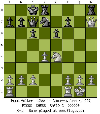 Last move : 0-1 2006 September 22 18:29:25 [Event "FICGS__CHESS__RAPID_C__000009"] [Site "FICGS"] [Date "2006.09.13"] [Round "1"] [White "Hess,Volker"] [Black "Caburro,John"] [Result "0-1"] [WhiteElo "1200"] [BlackElo "1400"] 1.e4 d5 2.exd5 Qxd5 3.Nc3 Qa5 4.Nf3 c6 5.d4 Nf6 6.Be2 Bf5 7.O-O e6 8.Bd2 Qc7 9.Ne5 Bd6 10.Bf4 Nbd7 11.Nxd7 Nxd7 12.Bxd6 Qxd6 13.Bg4 Bxg4 14.Qxg4 O-O-O 15.Qxg7 Rhg8 16.Qxh7 Rh8 17.Ne4 Qc7 0-1 Scandinavian (centre counter) defense Kingside Castling by player White (move 7) Queenside Castling by player Black (move 14) Player Black won this chess game. Follow this game move after move (download)Chess is a part of culture and if a culture is declining then Chess too will decline. (Mikhail Botvinnik) Wenn Du nicht kämpfst, um anderen etwas zu beweisen, sondern nur für Dich selbst, dann bist du fast unbesiegbar. (Garry Kasparov) El Ajedrez es una manera fabulosa para que los niños aprendan a autovalorarse y a autoestimarse. (Saudin Robovic) J'apprécie les joueurs d'est-indienne, c'est grâce à eux que je nourris ma famille depuis tant d'années. (Petrosian) No enterprise is more likely to succeed than one concealed from the enemy until it is ripe for execution. (Niccolo Machiavelli)