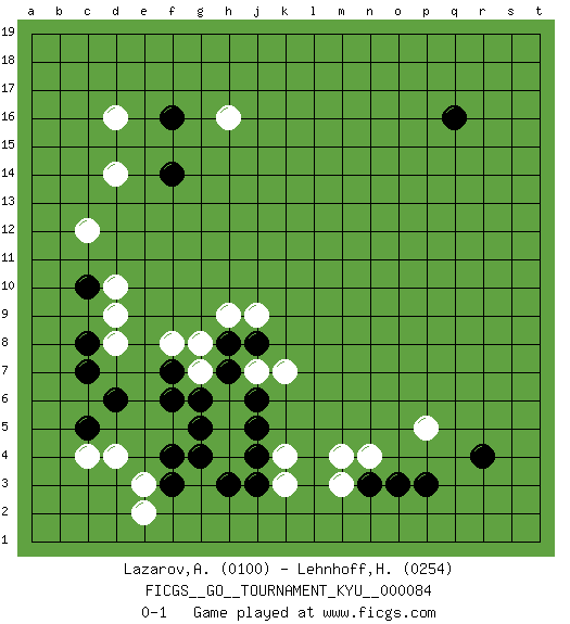 Last move : 0-1 2009 September 12 22:3:29 [Event "FICGS__GO__TOURNAMENT_KYU__000084"] [Site "FICGS"] [Date "2009.06.09"] [Round "1"] [Black "Lazarov,Alexander"] [White "Lehnhoff,Heinz-Georg"] [Result "0-1"] [Rating 1 "0100"] [Rating 2 "0254"] 1.q16 d4 2.r4 d16 3.p3 n4 4.n3 m3 5.o3 m4 6.c10 c12 7.c7 d8 8.c8 d9 9.d6 d10 10.f4 e3 11.c5 c4 12.f3 e2 13.j3 k4 14.j4 k3 15.f6 g7 16.f7 f8 17.g6 h6 18.h7 g8 19.j6 h5 20.j5 j7 21.h8 h9 22.j8 k7 23.g5 h4 24.h3 j9 25.g4 p5 26.f16 h16 27.f14 d14 0-1 This go game has been lost on time (started : 2009.06.09 2:0:13) Here are the names of the openings (joseki) played in the four corners : Corner d4 : d4 c7 Hoshi (Hwajeom, Seongjeom, Xingwei`) 4-4 Point. The star or hoshi (4-4) point, emphasizing influence at the potential expense of territory. Nikken Kakari (Dukan Keolch'im, E`r Gua`jiao~, 2-Space Low Approach). White typically answers by 7-3 or 3-5 (which is not joseki). Player White won this Go (weiqi, baduk) game. Follow this game move after move (download)A knight's move near the edge of the board cannot be cut. (Bill Taylor) To be champion requires more than simply being a strong player; one has to be a strong human being as well. (Anatoly Karpov)