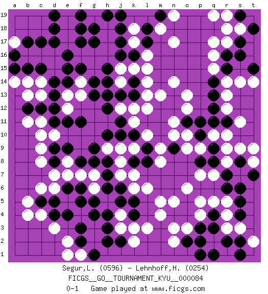 Last move : 0-1 2010 February 16 20:19:37 [Event "FICGS__GO__TOURNAMENT_KYU__000084"] [Site "FICGS"] [Date "2009.06.09"] [Round "1"] [Black "Segur,Laurine"] [White "Lehnhoff,Heinz-Georg"] [Result "0-1"] [Rating 1 "0596"] [Rating 2 "0254"] 1.d4 q16 2.q4 d16 3.f17 f16 4.e16 e17 5.e15 d15 6.f15 g16 7.g17 h16 8.d17 e18 9.d18 e19 10.f18 h17 11.f19 g15 12.e14 f14 13.d14 c14 14.g14 f13 15.h14 e13 16.d13 c13 17.d12 d10 18.c12 b13 19.c17 c16 20.a16 b16 21.b15 a17 22.a15 a14 23.b17 b14 24.c15 e12 25.f11 c11 26.d11 c10 27.b12 b11 28.e11 q10 29.q13 r13 30.q14 r14 31.q12 r12 32.r15 q15 33.r16 r17 34.s17 q17 35.s16 s14 36.t18 r18 37.t15 t14 38.s19 s18 39.r19 q19 40.r11 t19 41.s19 r19 42.p10 s11 43.q11 c6 44.d8 c8 45.k16 j15 46.k14 j14 47.g13 k15 48.j16 l16 49.j17 h18 50.j18 k18 51.h19 g19 52.d19 r10 53.j19 l15 54.h15 r3 55.p3 r4 56.r6 n3 57.s5 r5 58.s6 q5 59.s4 p5 60.o4 n5 61.n4 m4 62.q3 m5 63.o5 o6 64.o2 n2 65.r2 s3 66.p1 q2 67.s2 t2 68.s1 l14 69.k13 l13 70.j13 b4 71.c5 b5 72.g4 d3 73.e4 j3 74.q1 o3 75.p2 p4 76.k4 j4 77.k5 k6 78.j5 k3 79.h4 o12 80.o11 n11 81.l18 c4 82.d5 d6 83.e6 p9 84.n12 o13 85.n13 n14 86.m12 l12 87.m11 n10 88.n9 o10 89.p11 o9 90.h10 l10 91.m10 m9 92.l11 k11 93.l9 m13 94.j10 k9 95.l8 m8 96.k8 l6 97.j6 k17 98.g18 g6 99.g8 f7 100.f8 e7 101.f5 e8 102.e9 j7 103.f6 g7 104.f3 h5 105.h6 j8 106.k10 j9 107.h7 d7 108.d9 c9 109.g5 r8 110.s8 s9 111.r7 t8 112.q8 r9 113.t7 t9 114.q9 q7 115.p8 p7 116.l17 n17 117.h3 l3 118.j2 k2 119.h2 m18 120.j11 e2 121.f2 h9 122.g9 j12 123.h12 k12 124.h13 f1 125.g1 e1 126.h8 k7 127.m19 n19 0-1 Here are the names of the openings (joseki) played in the four corners : Corner d16 : d16 f17 Hoshi (Hwajeom, Seongjeom, Xingwei`) 4-4 Point. The star or hoshi (4-4) point, emphasizing influence at the potential expense of territory. Ikken Kakari (Hankan Keolch'im, Yi Gua`jiao~, 1-Space Low Approach). Black 2 is the standard approach move to the 4-4. Corner q16 : q16 q13 Hoshi (Hwajeom, Seongjeom, Xingwei`) 4-4 Point. The star or hoshi (4-4) point, emphasizing influence at the potential expense of territory. Nikken Takagakari (Dukan Nop'dakeolch'im, E`r Gaojia, 2-Space High Approach). Black 2 is a light approach move. Rarely played in even games, Black 2 is typically employed in handicap games. White continues with 6-4 or 3-10. In Korean Sunjang Baduk White has a stone on 8-4. Corner d4 : d4 c6 Hoshi (Hwajeom, Seongjeom, Xingwei`) 4-4 Point. The star or hoshi (4-4) point, emphasizing influence at the potential expense of territory. Ikken Kakari (Hankan Keolch'im, Yi Gua`jiao~, 1-Space Low Approach). White 2 is the standard approach move to the 4-4. Corner q4 : q4 r3 Hoshi (Hwajeom, Seongjeom, Xingwei`) 4-4 Point. The star or hoshi (4-4) point, emphasizing influence at the potential expense of territory. Player White won this Go (weiqi, baduk) game. Follow this game move after move (download)If there is no stone on the handicap point, the carpenter's square is dead. (Anonymous) Now the reason the enlightened prince and the wise general conquer the enemy whenever they move and their achievements surpass those of ordinary men is foreknowledge. (Sun Tzu)