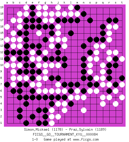 Last move : 1-0 2009 July 23 1:56:39 [Event "FICGS__GO__TOURNAMENT_KYU__000084"] [Site "FICGS"] [Date "2009.06.09"] [Round "1"] [Black "Simon,Mickael"] [White "Praz,Sylvain"] [Result "1-0"] [Rating 1 "1178"] [Rating 2 "1189"] 1.q16 d3 2.d16 q4 3.c5 f4 4.c9 r14 5.o17 s16 6.r17 r11 7.l17 k3 8.r6 n3 9.r9 c14 10.c12 c17 11.d17 c16 12.d15 d18 13.e18 c18 14.f17 b14 15.e13 s4 16.s17 p6 17.p9 p11 18.n9 n7 19.l4 k6 20.j5 k4 21.k5 l5 22.l6 m5 23.k7 m6 24.l7 h3 25.n11 o10 26.n8 o9 27.o8 p8 28.p10 o11 29.n10 q8 30.r8 q9 31.r10 q10 32.s11 s12 33.s10 r12 34.o7 o6 35.p7 q7 36.q6 q5 37.m7 r7 38.s7 s6 39.s5 r5 40.t8 t11 41.n6 n5 42.p14 e11 43.f12 f11 44.g11 j6 45.h5 h6 46.g5 g6 47.f5 f6 48.e5 d6 49.d5 c8 50.e6 e7 51.d7 d8 52.c7 b8 53.e8 f7 54.d9 b7 55.c6 b9 56.e9 c10 57.d11 d10 58.e10 f10 59.b10 g10 60.h11 h10 61.j11 g12 62.d13 b11 63.c11 a10 64.b12 c10 65.d10 b10 66.b6 a12 67.a13 e12 68.f13 j10 69.k11 j7 70.k10 f8 71.f9 g9 72.h8 g8 73.j8 c13 74.d12 h13 75.n13 g17 76.g16 h17 77.h16 k18 78.j17 j18 79.k17 l18 80.m17 m18 81.n18 g18 82.f16 f18 83.e19 f19 84.c15 b15 85.c3 e4 86.d4 d2 87.c2 e3 88.d14 r15 89.o12 p13 90.o14 p12 91.q14 q13 92.h19 j19 93.q15 r16 94.g3 g4 95.j3 j4 96.h4 h2 97.g2 j2 98.d1 f2 99.f1 h1 100.g1 e1 101.e2 b13 102.a11 e1 103.h18 g19 104.e2 a12 105.r6 t5 106.a11 e1 107.b16 a16 108.e2 a12 109.h19 h18 110.a11 e1 111.a15 b17 112.e2 a12 113.m19 l19 114.a11 e1 115.t6 t7 116.a12 a14 117.e2 j16 118.f3 j15 119.g14 h14 120.h15 k14 121.j13 k13 122.j12 j14 123.l15 e17 124.e16 d19 125.e17 f15 126.a7 1-0 Here are the names of the openings (joseki) played in the four corners : Corner d4 : d3 c5 Komoku (Somok, Xiao~mu`) 3-4 Point. The komoku (3-4) point is the traditional corner enclosure move.. Ikken Kakari (Hankan Keolch'im, Yi Gua`jiao~, 1-Space Low Pincer). The small knight move is the basic approach move to the 3-4 point stone. It has been continually used for over four centuries. There are limitless variations, with new moves constantly being discovered. Black 2 opens the door to a treaure store of joseki. Corner q16 : q16 r14 Hoshi (Hwajeom, Seongjeom, Xingwei`) 4-4 Point. The star or hoshi (4-4) point, emphasizing influence at the potential expense of territory. Ikken Kakari (Hankan Keolch'im, Yi Gua`jiao~, 1-Space Low Approach). White 2 is the standard approach move to the 4-4. Corner q4 : q4 r6 Hoshi (Hwajeom, Seongjeom, Xingwei`) 4-4 Point. The star or hoshi (4-4) point, emphasizing influence at the potential expense of territory. Ikken Kakari (Hankan Keolch'im, Yi Gua`jiao~, 1-Space Low Approach). Black 2 is the standard approach move to the 4-4. Corner d16 : d16 c14 Hoshi (Hwajeom, Seongjeom, Xingwei`) 4-4 Point. The star or hoshi (4-4) point, emphasizing influence at the potential expense of territory. Ikken Kakari (Hankan Keolch'im, Yi Gua`jiao~, 1-Space Low Approach). White 2 is the standard approach move to the 4-4. Player Black won this Go (weiqi, baduk) game. Follow this game move after move (download)Attach to the strongest stone in a pincer. (Anonymous) Always remember that you are unique; just like everyone else. (Unknown)