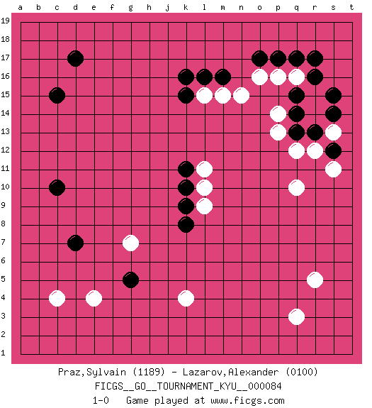 Last move : 1-0 2009 September 18 10:26:19 [Event "FICGS__GO__TOURNAMENT_KYU__000084"] [Site "FICGS"] [Date "2009.06.09"] [Round "1"] [Black "Praz,Sylvain"] [White "Lazarov,Alexander"] [Result "1-0"] [Rating 1 "1189"] [Rating 2 "0100"] 1.r16 c4 2.d17 q3 3.c15 r5 4.k16 k4 5.k10 p16 6.p17 q16 7.q17 r15 8.r17 o16 9.o17 q10 10.q15 r14 11.q14 p14 12.q13 p13 13.r13 s13 14.s12 q12 15.s15 l15 16.l16 m15 17.m16 n15 18.k15 r12 19.s14 s11 20.d7 e4 21.c10 l11 22.k11 l10 23.k9 l9 24.k8 g7 25.g5 1-0 This go game has been lost on time (started : 2009.06.09 2:0:13) Here are the names of the openings (joseki) played in the four corners : Corner q16 : r16 p16 Komoku (Somok, Xiao~mu`) 3-4 Point. The komoku (3-4) point is the traditional corner enclosure move.. Ikken Takagakari (Hankan Nop'dakeolch'im, Yi Gaogua`jiao~, 1-Space High Approach). The 5-4 approach move has become more popular in modern times, as modern Go emphasizes speed and influence. Corner d4 : c4 d7 Komoku (Somok, Xiao~mu`) 3-4 Point. The komoku (3-4) point is the traditional corner enclosure move.. Player Black won this Go (weiqi, baduk) game. Follow this game move after move (download)In opponents' sphere of influence, avoid sharp conflict, don't move too deep. (Otake Hideo, 9p) Memory is a way of holding onto the things you love, the things you are, the things you never want to lose. (from the television show: The Wonder Years)