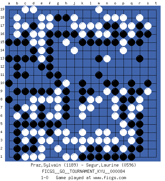 Last move : 1-0 2009 November 9 19:54:41 [Event "FICGS__GO__TOURNAMENT_KYU__000084"] [Site "FICGS"] [Date "2009.06.09"] [Round "1"] [Black "Praz,Sylvain"] [White "Segur,Laurine"] [Result "1-0"] [Rating 1 "1189"] [Rating 2 "0596"] 1.r16 d4 2.d17 q4 3.c15 d16 4.c16 c17 5.e17 d15 6.d14 e15 7.c13 b17 8.c18 b16 9.b15 b18 10.d18 b14 11.a15 c14 12.b13 f17 13.f16 e14 14.d13 e16 15.g16 f18 16.f13 e18 17.f14 d19 18.f15 c19 19.c6 k4 20.d9 d11 21.c11 e13 22.e12 e11 23.f11 d12 24.f12 e10 25.f9 a14 26.a13 c12 27.b12 c10 28.b11 d10 29.c9 b10 30.b9 a9 31.a8 f10 32.g10 g4 33.r6 r8 34.p6 q6 35.q5 q7 36.r5 p4 37.r4 p5 38.r3 m4 39.q10 o6 40.p7 o7 41.p8 o8 42.q8 r7 43.r9 p17 44.q15 m17 45.o16 o18 46.n17 n16 47.n15 m16 48.o17 n18 49.p16 p18 50.m15 m19 51.l15 j18 52.o9 n9 53.o10 s9 54.s10 m8 55.m11 k16 56.l16 l17 57.k15 q17 58.e6 g6 59.f5 e4 60.f4 f3 61.g5 h4 62.h6 g7 63.h7 g8 64.h8 g9 65.h9 e2 66.o2 n4 67.m2 p2 68.q2 o3 69.p1 q3 70.r2 n2 71.n1 o1 72.d17 e17 73.o2 n3 74.o1 m3 75.l2 k2 76.l9 h10 77.g11 f8 78.e9 f6 79.e5 e8 80.a10 d6 81.d5 d7 82.c5 c7 83.e7 d8 84.b3 c4 85.b4 b6 86.b5 k6 87.k8 l7 88.r17 r18 89.j2 j3 90.k1 k3 91.h2 g2 92.d3 c3 93.c2 e3 94.d2 d1 95.b1 e1 96.b7 s17 97.s16 q16 98.r15 p15 99.o15 p14 100.r13 p9 101.q9 l8 102.k10 k7 103.k9 n13 104.m13 h15 105.h16 j14 106.j16 k17 107.n10 c1 108.b2 h3 109.q1 h1 110.l1 l3 111.m1 j1 112.h18 j17 113.g18 1-0 Here are the names of the openings (joseki) played in the four corners : Corner d4 : d4 c6 Hoshi (Hwajeom, Seongjeom, Xingwei`) 4-4 Point. The star or hoshi (4-4) point, emphasizing influence at the potential expense of territory. Ikken Kakari (Hankan Keolch'im, Yi Gua`jiao~, 1-Space Low Approach). Black 2 is the standard approach move to the 4-4. Corner q4 : q4 r6 Hoshi (Hwajeom, Seongjeom, Xingwei`) 4-4 Point. The star or hoshi (4-4) point, emphasizing influence at the potential expense of territory. Ikken Kakari (Hankan Keolch'im, Yi Gua`jiao~, 1-Space Low Approach). Black 2 is the standard approach move to the 4-4. Corner q16 : r16 p17 Komoku (Somok, Xiao~mu`) 3-4 Point. The komoku (3-4) point is the traditional corner enclosure move.. Ikken Kakari (Hankan Keolch'im, Yi Gua`jiao~, 1-Space Low Pincer). The small knight move is the basic approach move to the 3-4 point stone. It has been continually used for over four centuries. There are limitless variations, with new moves constantly being discovered. White 2 opens the door to a treaure store of joseki. Player Black won this Go (weiqi, baduk) game. Follow this game move after move (download)When in doubt, remove the enemy stones from the board. (Bill Taylor) Rules and bones are meant to be broken. (Anonymous)