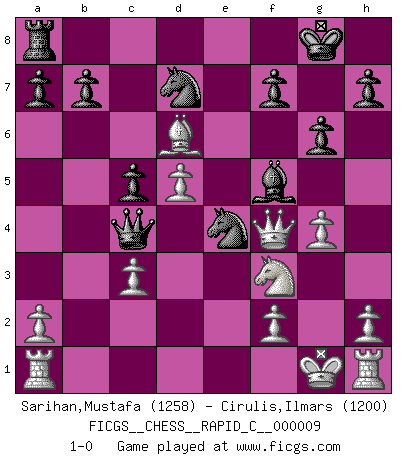 Last move : 1-0 2007 February 28 6:2:7 [Event "FICGS__CHESS__RAPID_C__000009"] [Site "FICGS"] [Date "2006.09.13"] [Round "1"] [White "Sarihan,Mustafa"] [Black "Cirulis,Ilmars"] [Result "1-0"] [WhiteElo "1258"] [BlackElo "1200"] 1.d4 Nf6 2.c4 g6 3.Nc3 Bg7 4.Nf3 c5 5.d5 O-O 6.e4 Qa5 7.e5 Ng4 8.Bf4 d6 9.exd6 Bxc3+ 10.bxc3 exd6 11.Qc2 Bf5 12.Qd2 Re8+ 13.Be2 Rxe2+ 14.Kxe2 Qa4 15.Kf1 Qxc4+ 16.Kg1 Nf6 17.Bxd6 Ne4 18.Qf4 Nd7 19.g4 1-0 This chess game has been lost on time (started : 2006.09.13 18:23:54) King's Indian defense, 3.Nc3 Kingside Castling by player Black (move 5) Player White won this chess game. Follow this game move after move (download)It is the aim of the modern school, not to treat every position according to one general law, but according to the principle inherent in the position. (Richard Reti) Ich spiele ehrlich und spiele, um zu gewinnen. Wenn ich verliere nehme ich meine Medizin. (Robert James Fischer) Los asuntos humanos son como una partida de Ajedrez: solo aquellos que no lo toman seriamente, pueden ser llamados buenos jugadores. (Hung Tzu Ch'eng) Le moment que je préfère le plus dans une rencontre, c'est celui où je sens que la personnalité de l'adversaire se brise. (Robert Fischer) A government big enough to give you everything you want is strong enough to take everything you have. (Thomas Jefferson)