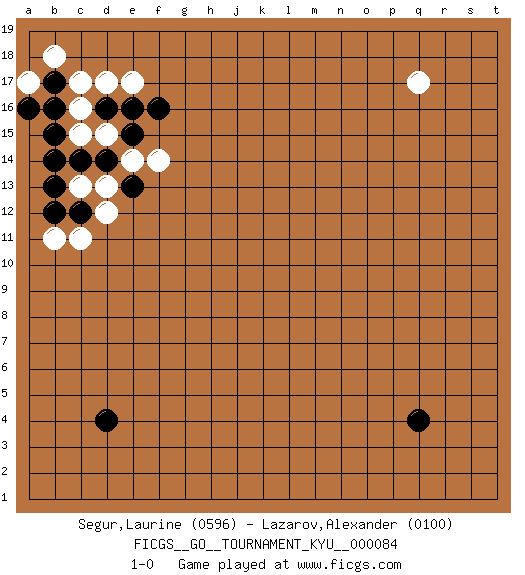 Last move : 1-0 2009 September 12 10:1:13 [Event "FICGS__GO__TOURNAMENT_KYU__000084"] [Site "FICGS"] [Date "2009.06.09"] [Round "1"] [Black "Segur,Laurine"] [White "Lazarov,Alexander"] [Result "1-0"] [Rating 1 "0596"] [Rating 2 "0100"] 1.d4 q17 2.q4 c16 3.e16 e17 4.d16 d17 5.b16 c15 6.b17 c17 7.b15 d13 8.c14 c13 9.d14 d15 10.e15 b18 11.b14 e14 12.e13 f14 13.f16 c11 14.c12 d12 15.b12 b11 16.b13 a17 17.a16 1-0 This go game has been lost on time (started : 2009.06.09 2:0:13) Here are the names of the openings (joseki) played in the four corners : Corner d16 : c16 e16 Komoku (Somok, Xiao~mu`) 3-4 Point. The komoku (3-4) point is the traditional corner enclosure move.. Ikken Takagakari (Hankan Nop'dakeolch'im, Yi Gaogua`jiao~, 1-Space High Approach). The 5-4 approach move has become more popular in modern times, as modern Go emphasizes speed and influence. Corner d4 : d4 1-0 Hoshi (Hwajeom, Seongjeom, Xingwei`) 4-4 Point. The star or hoshi (4-4) point, emphasizing influence at the potential expense of territory. Player Black won this Go (weiqi, baduk) game. Follow this game move after move (download)Go uses the most elemental materials and concepts - line and circle, wood and stone, black and white - combining them with simple rules to generate subtle strategies and complex tactics that stagger the imagination. (Iwamoto Kaoru, 9 dan professional Go player and former Honinbo title holder) It is not enough to be a good player... you must also play well. (Siegbert Tarrasch)