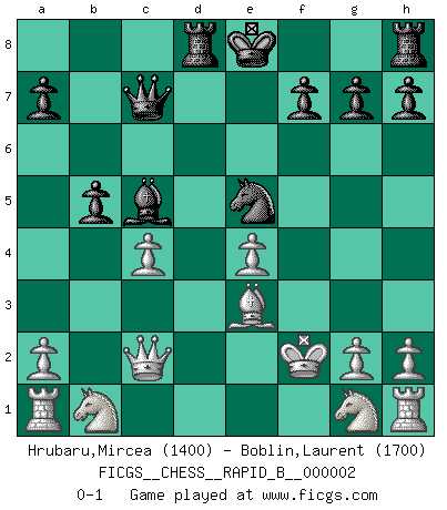 Last move : 0-1 2006 June 13 12:2:6 [Event "FICGS__CHESS__RAPID_B__000002"] [Site "FICGS"] [Date "2006.04.19"] [Round "1"] [White "Hrubaru,Mircea"] [Black "Boblin,Laurent"] [Result "0-1"] [WhiteElo "1400"] [BlackElo "1700"] 1.e4 c6 2.d4 d5 3.exd5 cxd5 4.c4 Nf6 5.Bg5 Ne4 6.Be3 e5 7.dxe5 Bb4+ 8.Ke2 Be6 9.f3 d4 10.fxe4 Bxc4+ 11.Kf3 Bxf1 12.Qxd4 Qa5 13.Qd1 Ba6 14.Qd5 Qc7 15.Kf2 Bc4 16.Qd4 b5 17.b3 Nc6 18.Qd1 Rd8 19.Qc2 Nxe5 20.bxc4 Bc5 0-1 Caro-Kann : Panov-Botvinnik attack Player Black won this chess game. Follow this game move after move (download)My opponents make good moves too. Sometimes I don't take these things into consideration. (Bobby Fischer) Es ist im Leben wie im Schachspiel. Wir entwerfen einen Plan, dieser bleibt jedoch bedingt durch das, was im Schachspiel dem Gegner, im Leben dem Schicksal zu tun belieben wird. (Arthur Schopenhauer) Con el tiempo, empecé a progresar en partidas decisivas. Tal vez porque me di cuenta de una simple verdad: no solo estaba yo nervioso sino también mi oponente. (Mikhail Tal) Avec des compensations pour le matériel en plus... (Anonyme) First of all, we have to go back to the classical time control. (Anatoly Karpov)