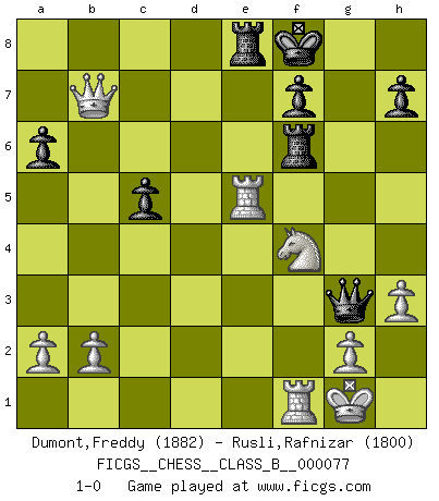 Last move : 1-0 2009 November 18 8:39:7 [Event "FICGS__CHESS__CLASS_B__000077"] [Site "FICGS"] [Date "2009.06.10"] [Round "1"] [White "Dumont,Freddy"] [Black "Rusli,Rafnizar"] [Result "1-0"] [WhiteElo "1882"] [BlackElo "1800"] 1.e4 c5 2.Nf3 Nc6 3.d4 cxd4 4.Nxd4 e5 5.Nb5 d6 6.c4 Nf6 7.Bg5 a6 8.Bxf6 gxf6 9.N5c3 Rg8 10.Nd5 f5 11.Nbc3 Be6 12.exf5 Bxf5 13.Bd3 Bxd3 14.Qxd3 Rg6 15.O-O Bh6 16.Qe4 Kf8 17.f4 Bxf4 18.Nxf4 exf4 19.Nd5 Ne5 20.Nxf4 Rh6 21.Rae1 Qh4 22.h3 Re8 23.Qxb7 Rf6 24.Re4 Qg3 25.c5 dxc5 26.Rxe5 1-0 Sicilian : Labourdonnais-Loewenthal (Kalashnikov) variation Kingside Castling by player White (move 15) Player White won this chess game. Follow this game move after move (download)It is always better to sacrifice your opponent's men. (Savielly Tartakower) Ich war zu klein für die Schach-Schülermannschaft! (Woody Allen) El Ajedrez es el juego mas altamente simbólico, pero las agresiones estan por lo tanto aún mas francamente representadas en la partida. Tal vez comenzo como un juego de guerra; Algo como la representación de una batalla en miniatura entre las fuerzas de dos reinos. (Karl Meninger) Votre prénom est 'Tactique', votre deuxième prénom est 'Tactique' et votre nom est 'Tactique'. (Ken Smith) Men should grow up. - Yeah. And dogs should stop licking themselves. It's not gonna happen. (Gregory House to Dr. Cameron, House M.D.)