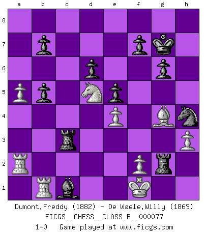 Last move : 1-0 2009 October 23 18:30:14 [Event "FICGS__CHESS__CLASS_B__000077"] [Site "FICGS"] [Date "2009.06.10"] [Round "1"] [White "Dumont,Freddy"] [Black "De Waele,Willy"] [Result "1-0"] [WhiteElo "1882"] [BlackElo "1869"] 1.e4 c5 2.Nf3 d6 3.d4 cxd4 4.Nxd4 Nf6 5.Nc3 a6 6.Be2 e5 7.Nb3 Be7 8.O-O O-O 9.Be3 Be6 10.Qd2 Nbd7 11.a4 Rc8 12.a5 Qc7 13.Bf3 h6 14.Rfd1 Rfe8 15.Qe1 Nf8 16.Nc1 Ng6 17.Bb6 Qc6 18.Nd3 Bd8 19.Be3 Qc7 20.Qe2 Nh4 21.h3 Qc6 22.g4 h5 23.g5 Nh7 24.Bxh5 Nxg5 25.Bxg5 Bxg5 26.Nb4 Qc5 27.Nbd5 Bd8 28.b4 Qc4 29.Qe3 Qc6 30.b5 axb5 31.Be2 Bxd5 32.Nxd5 Re6 33.Rdb1 Rg6+ 34.Kf1 Rg2 35.Ra2 Qd7 36.Qd3 Rc4 37.c3 Bg5 38.Nb6 Qe6 39.Bg4 Rxc3 40.Bxe6 Rxd3 41.Bg4 g6 42.Nd7 Rc3 43.Nb6 Rc5 44.Nd7 Rc7 45.Nb6 Rc3 46.Rab2 Bc1 47.Ra2 Kg7 48.Nd5 1-0 Sicilian : Najdorf, Opovcensky variation Kingside Castling by player White (move 8) Kingside Castling by player Black (move 8) Player White won this chess game. Follow this game move after move (download)Chess makes man wiser and clear-sighted. (Vladimir Putin) Es ist peinlich, dass ich nie Weltmeister wurde. Es wäre leicht, Leonid Breschnjew als Ursache vorzuschieben, dessen Apparat den Vorzeigekommunisten Anatoli Karpow in allem unterstützte. Aber Garri Kasparow zum Beispiel, der ebenfalls von den Sowjets unerwünscht war, hat trotz der Widerstände den WM-Titel erobert. (Viktor Kortschnoi) Yo no le temo a Spassky. Todos saben que yo soy el mejor. Uno no necesita un torneo para probarlo. (Bobby Fischer) Si rien de grave n'est détecté lors de l'analyse d'une position, on joue alors le coup. Seconde règle de Blumenfeld. Is not life a hundred times too short to bore ourselves ? (Friedrich Nietzsche)