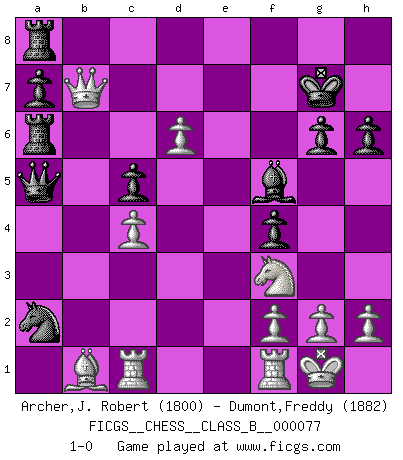 Last move : 1-0 2009 December 29 10:33:33 [Event "FICGS__CHESS__CLASS_B__000077"] [Site "FICGS"] [Date "2009.06.10"] [Round "1"] [White "Archer,J. Robert"] [Black "Dumont,Freddy"] [Result "1-0"] [WhiteElo "1800"] [BlackElo "1882"] 1.d4 Nf6 2.c4 c6 3.Nc3 d5 4.Nf3 e6 5.Bg5 Nbd7 6.e3 Qa5 7.cxd5 Nxd5 8.Qd2 Bb4 9.Rc1 f6 10.Bh4 O-O 11.Bd3 e5 12.O-O exd4 13.exd4 h6 14.Bg3 f5 15.Qc2 Bxc3 16.bxc3 f4 17.Bh4 N7f6 18.c4 Nb4 19.Qc3 c5 20.Bxf6 Rxf6 21.d5 Ra6 22.Bb1 Nxa2 23.Qd3 g6 24.d6 Bf5 25.Qd5+ Kg7 26.Qxb7+ 1-0 Queen's pawn game Kingside Castling by player Black (move 10) Kingside Castling by player White (move 12) Player White won this chess game. Follow this game move after move (download)The chessboard is the world, the pieces are the phenomena of the Universe, the rules of the game are what we call the laws of Nature and the player on the other side is hidden from us. (Thomas Huxley) Es macht mich traurig, wenn ich sehe, dass Golfprofis mehr verdienen als Schachsportler. Obwohl ich davon überzeugt bin, dass wir Schachspieler viel härter trainieren müssen als die Golfer. (Alexandra Kosteniuk) El Ajedrez es el arte del análisis. (Mikhail Botvinnik) A ce moment-là, je menaçais de comprendre la position ! (Clément L'Heureux) Knowledge will give you power, but character respect. (Bruce Lee)