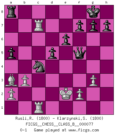 Last move : 0-1 2009 July 8 19:37:27 [Event "FICGS__CHESS__CLASS_B__000077"] [Site "FICGS"] [Date "2009.06.10"] [Round "1"] [White "Rusli,Rafnizar"] [Black "Klarzynski,Slawomir"] [Result "0-1"] [WhiteElo "1800"] [BlackElo "1800"] 1.d4 Nf6 2.c4 e6 3.Nf3 b6 4.g3 Ba6 5.Qa4 Bb7 6.Bg2 c5 7.dxc5 Bxc5 8.O-O O-O 9.Nc3 a5 10.Rd1 Ng4 11.e3 Qf6 12.h3 Bxf3 13.Bxf3 Qxf3 14.hxg4 Qxg4 15.Qc2 Qxc4 16.b3 Qg4 17.Na4 d5 18.Nxc5 bxc5 19.Ba3 Nd7 20.Kg2 Ne5 21.Qxc5 Qf3+ 22.Kg1 Rfc8 23.Qd4 Rc2 24.Rd2 Qf5 25.Rxc2 Nf3+ 26.Kf1 Nxd4 27.Rc7 Nc2 28.Rc1 Nxe3+ 29.Ke2 Nc4 0-1 Queen's Indian : Nimzovich variation (exaggerated Fianchetto) Kingside Castling by player White (move 8) Kingside Castling by player Black (move 8) Player Black won this chess game. Follow this game move after move (download)If a ruler does not understand Chess, how can he rule over a kingdom ? (King Khusros II) Wir können eben der zündenden Macht des Opfers nicht wiederstehen, denn die Begeisterung für das Opfer liegt in der Natur des Menschen. (Rudolf Spielmann) El Ajedrez es un juego terrible. Si no dominas el centro, tu oponente tiene una posición mas libre. Si tu tienes el centro, entonces realmente tienes algo de que preocuparte. (Siegbert Tarrasch) Demandez au pauvre Cg1 ce qu'il en pense. Eduard Gufeld à propos de la variante Saemisch de l'Est-Indienne. Shallow men believe in luck. Strong men belive in cause and effect. (Ralph Waldo Emerson)