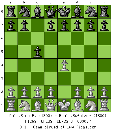 Last move : 0-1 2009 July 20 23:8:52 [Event "FICGS__CHESS__CLASS_B__000077"] [Site "FICGS"] [Date "2009.06.10"] [Round "1"] [White "Dall,Ries P."] [Black "Rusli,Rafnizar"] [Result "0-1"] [WhiteElo "1800"] [BlackElo "1800"] 1.e4 c5 0-1 This chess game has been lost on time (started : 2009.06.10 13:35:58) Sicilian defense Player Black won this chess game. Follow this game move after move (download)First-class players lose to second class players because second-class players sometimes play a first-class game. (Tarrasch) Die FIDE ist dabei in die Hände der russischen Mafia zu fallen. (Larry Evans) Los tropiezos estan todos ahí en el tablero, esperando que se cometan. (Savielly Tartakover) Les ravages du H expliquent la différence de niveau entre Tal et Thal [Abergel]. I take risks, sometimes patients die, but not taking risks causes more patients to die. So I guess my biggest problem is I've been cursed with the ability to do the math. (Gregory House, House M.D.)