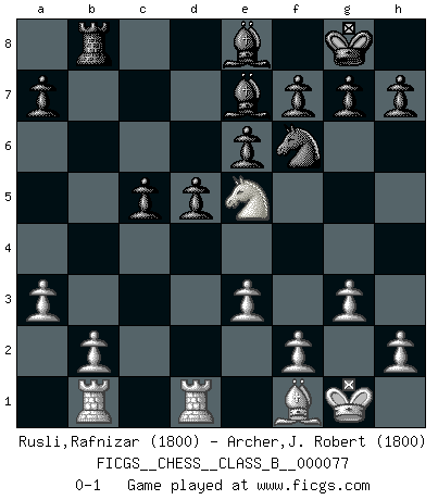 Last move : 0-1 2009 December 24 10:28:26 [Event "FICGS__CHESS__CLASS_B__000077"] [Site "FICGS"] [Date "2009.06.10"] [Round "1"] [White "Rusli,Rafnizar"] [Black "Archer,J. Robert"] [Result "0-1"] [WhiteElo "1800"] [BlackElo "1800"] 1.d4 Nf6 2.c4 e6 3.Nf3 b6 4.g3 Ba6 5.Qa4 Bb7 6.Bg2 c5 7.dxc5 bxc5 8.Nc3 Be7 9.O-O O-O 10.Rd1 Qb6 11.Rb1 Rd8 12.Bf4 Nc6 13.Nb5 Ne8 14.a3 Na5 15.Bd2 Nxc4 16.Qxc4 d5 17.Qa4 Bc6 18.Ba5 Qxb5 19.Qxb5 Bxb5 20.Bxd8 Rxd8 21.e3 Nf6 22.Bf1 Be8 23.Ne5 Rb8 0-1 Queen's Indian : Nimzovich variation (exaggerated Fianchetto) Kingside Castling by player White (move 9) Kingside Castling by player Black (move 9) Player Black won this chess game. Follow this game move after move (download)A Chess game is divided into three stages: the first, when you hope you have the advantage, the second when you believe you have an advantage, and the third... when you know you're going to lose ! (Savielly Tartakower) Konzentriere dich auf materielle Gewinne. Nimm, was dir dein Gegner gibt, ausser es gibt einen guten Grund der dagegenspricht. (Robert James Fischer) Estaba muy claro de que el punto vulnerable del Gran Maestro Americano (Bobby Fischer) radicaba en las posiciones de doble filo, colgantes, irracionales, donde el siempre falló en encontrar un triunfo aún en una posición de clara victoria. (Efim Geller) L'attaque fait le spectacle, la défense gagne les matchs. (Dicton footballistique) It's not enough to succeed. Others must fail. (Gore Vidal)