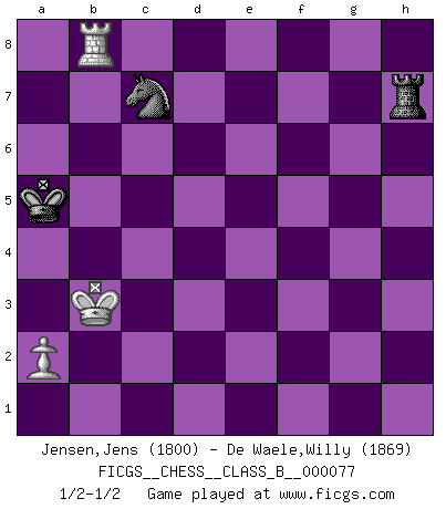 Last move : 1/2-1/2 2009 July 15 18:27:56 [Event "FICGS__CHESS__CLASS_B__000077"] [Site "FICGS"] [Date "2009.06.10"] [Round "1"] [White "Jensen,Jens"] [Black "De Waele,Willy"] [Result "1/2-1/2"] [WhiteElo "1800"] [BlackElo "1869"] 1.e4 c5 2.Nf3 d6 3.d4 cxd4 4.Nxd4 Nf6 5.Nc3 a6 6.Be3 e5 7.Nb3 Be6 8.f3 Be7 9.Qd2 O-O 10.O-O-O Nbd7 11.g4 b5 12.g5 b4 13.Ne2 Ne8 14.Ng3 a5 15.Kb1 Nc7 16.f4 a4 17.Nc1 exf4 18.Bxf4 Nc5 19.Bxd6 a3 20.Bxc5 Qxd2 21.Rxd2 Bxc5 22.Nf5 g6 23.Nd4 Rfd8 24.Nxe6 Nxe6 25.Rd5 Rxd5 26.exd5 Nxg5 27.Bg2 f5 28.c4 bxc3 29.bxc3 Re8 30.Kc2 Nf7 31.Bf1 Bd6 32.Nb3 Kg7 33.c4 Ne5 34.Nd4 Kf6 35.Bd3 f4 36.Be2 Nd7 37.Kd2 Bb4+ 38.Kd1 Bc5 39.Nb3 Be3 40.Kc2 Ke7 41.Rf1 Kd6 42.Rb1 h5 43.h4 Bf2 44.Bd3 Bxh4 45.Nd4 Rc8 46.Nb5+ Ke7 47.Bxg6 Rxc4+ 48.Kb3 Rc5 49.Kxa3 Rxd5 50.Rh1 Kf6 51.Nc7 Rc5 52.Ne6 Kxe6 53.Rxh4 f3 54.Bxh5 f2 55.Rf4 Rxh5 56.Rxf2 Rh4 57.Rd2 Nc5 58.Rd1 Ke5 59.Rd8 Ne6 60.Ra8 Nc7 61.Rg8 Kd5 62.Rd8+ Kc4 63.Rc8 Rh7 64.Ka4 Kd4 65.Rd8+ Kc5 66.Rc8 Kd6 67.Rd8+ Kc6 68.Rc8 Kb6 69.Rb8+ Ka6 70.Kb3 Ka5 1/2-1/2 Sicilian : Najdorf, Byrne (English) attack Kingside Castling by player Black (move 9) Queenside Castling by player White (move 10) 10 pieces endgame at move 52 : White KRBP , Black KRBNPP WHITE : King + 1 Rook 1 Bishop 1 Pawn BLACK : King + 1 Rook 1 Bishop 1 Knight 2 Pawns 9 pieces endgame at move 53 : White KRBP , Black KRNPP WHITE : King + 1 Rook 1 Bishop 1 Pawn BLACK : King + 1 Rook 1 Knight 2 Pawns 8 pieces endgame at move 54 : White KRBP , Black KRNP WHITE : King + 1 Rook 1 Bishop 1 Pawn BLACK : King + 1 Rook 1 Knight 1 Pawn 7 pieces endgame at move 55 : White KRP , Black KRNP WHITE : King + 1 Rook 1 Pawn BLACK : King + 1 Rook 1 Knight 1 Pawn 6 pieces endgame at move 56 : White KRP , Black KRN WHITE : King + 1 Rook 1 Pawn BLACK : King + 1 Rook 1 Knight This chess game ended in a draw. Follow this game move after move (download)Botvinnik tried to take the mystery out of Chess, always relating it to situations in ordinary life. He used to call Chess a typical inexact problem similar to those which people are always having to solve in everyday life. (Garry Kasparov) Die Neutralität betrachte ich als eine schwere Krankheit. (Viktor Kortschnoi) La única cosa que los jugadores de Ajedrez tienen en común, es el Ajedrez. (Lodewijk Prins) Une platitude souvent récitée à propos des Echecs est qu'une des choses les plus difficiles à réaliser est de gagner une position gagnante. Cela ne manque pas de sens mais, pour ma part, j'ai toujours trouvé plus difficile de gagner une position perdante. (Tim Krabbe) Heh, heh, heh. Time to abandon ship. (General Grievous in Star Wars ep.3)