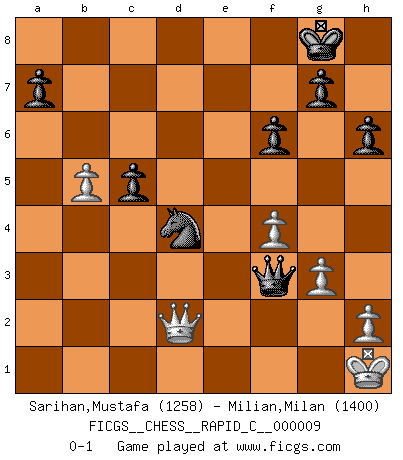 Last move : 0-1 2007 January 12 8:22:4 [Event "FICGS__CHESS__RAPID_C__000009"] [Site "FICGS"] [Date "2006.09.13"] [Round "1"] [White "Sarihan,Mustafa"] [Black "Milian,Milan"] [Result "0-1"] [WhiteElo "1258"] [BlackElo "1400"] 1.e4 e5 2.Nf3 Nf6 3.Nc3 Bb4 4.d3 d5 5.Bd2 d4 6.Nb1 Bxd2+ 7.Nbxd2 Nc6 8.Be2 Be6 9.O-O h6 10.c3 dxc3 11.bxc3 O-O 12.Nb3 Qd6 13.Qc2 Rfe8 14.Rad1 b6 15.d4 exd4 16.cxd4 Nb4 17.Qb1 Nxe4 18.Rc1 Bd5 19.Bc4 Bxc4 20.Rxc4 Nd5 21.Re1 Nec3 22.Rxe8+ Rxe8 23.Qa1 Ne2+ 24.Kh1 Ndf4 25.Qb1 b5 26.Rc2 Qg6 27.g3 Nh3 28.Nbd2 c6 29.Ne5 Qf5 30.f4 Nxd4 31.Rc1 Qe6 32.Rf1 c5 33.a4 f6 34.Nef3 Qd5 35.axb5 Re2 36.Qd3 Nf2+ 37.Rxf2 Rxf2 38.Qe3 Rxd2 39.Qxd2 Qxf3+ 0-1 Petrov Three knights game Kingside Castling by player White (move 9) Kingside Castling by player Black (move 11) Player Black won this chess game. Follow this game move after move (download)You must take your opponent into a deep dark forest where 2+2=5, and the path leading out is only wide enough for one. (Mikhail Tal) Ich tröste mich mit dem Vergnügen, daß Schachfans, Zuschauer und Leser glücklich sind, wenn ein Großmeister etwas riskiert, statt nur Klötzchen zu schieben. (Mikhail Nekhemyevich Tal) Un jugador que trata de regresar una movida en el Ajedrez es un futuro carterista. (Richard Fenton) Il n'y a pas de prix trop élevé au scalp de l'ennemi. (Koblentz) I teach you to lie, cheat and steal, and as soon as my back's turned you wait in line ? (Gregory House, House M.D.)