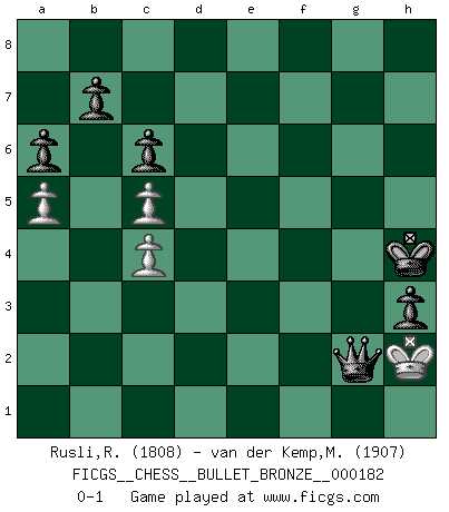 Last move : 0-1 2009 June 11 20:52:34 [Event "FICGS__CHESS__BULLET_BRONZE__000182"] [Site "FICGS"] [Date "2009.06.11"] [Round "1"] [White "Rusli,Rafnizar"] [Black "van der Kemp,Michel"] [Result "0-1"] [WhiteElo "1808"] [BlackElo "1907"] 1.d4 d5 2.c4 c6 3.Nc3 Nf6 4.Nf3 e6 5.e3 Nbd7 6.Qc2 Bd6 7.Bd3 O-O 8.b3 e5 9.dxe5 Nxe5 10.Nxe5 Bxe5 11.O-O d4 12.exd4 Qxd4 13.Bb2 Qh4 14.g3 Qh5 15.Be2 Bg4 16.Rfe1 Rfe8 17.Bxg4 Nxg4 18.h4 g5 19.Qf5 Bd4 20.Rf1 Re5 21.Qf3 gxh4 22.Rad1 Nxf2 23.Qxh5 Nxd1 24.Kh1 Rxh5 25.Rxd1 hxg3 26.Kg2 Rh2+ 27.Kxg3 Be5+ 28.Kf3 Rxb2 29.Ne4 f5 30.Nc5 Re8 31.Re1 Rf2+ 32.Kxf2 Bd4+ 33.Kf1 Rxe1+ 34.Kxe1 Bxc5 35.Ke2 Kf7 36.Kf3 h5 37.Kg2 Kg6 38.Kf3 Kg5 39.a4 h4 40.a5 a6 41.Kg2 Kg4 42.Kh2 h3 43.Kh1 f4 44.b4 f3 45.bxc5 f2 46.Kh2 Kh4 47.Kh1 f1Q+ 48.Kh2 Qg2+ 0-1 QGD Slav defense Kingside Castling by player Black (move 7) Kingside Castling by player White (move 11) 10 pieces endgame at move 45 : White KPPP , Black KPPPPP WHITE : King + 3 Pawns BLACK : King + 5 Pawns Promotion Queen by player Black (move 47) Player Black won this chess game. Follow this game move after move (download)Chess is so inspiring that I do not believe a good player is capable of having an evil thought during the game. (Wilhelm Steinitz) Es hat in meinem Leben Zeiten gegeben, in denen das Schachspiel, wenn nicht zum Lebenszweck, so doch zu einem regelrechten Lebensersatz geworden ist. Man fühlt sich in solchen Zeiten nicht so, als besäße man eine göttliche Gabe, sondern eher so, als sei man von ihr besessen. (Garry Kasparov) EL Ajedrez es como la vida. (Boris Spassky) Un millionnaire : 'Monsieur Steinitz ! Vous ne participez aux tournois que pour l'argent, alors que moi je n'y viens que pour l'honneur.' Steinitz : 'Chacun joue pour ce qu'il n'a pas'... Go and wake up your luck. (Persian saying)