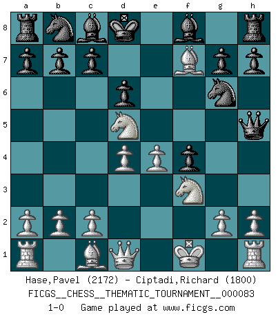 Last move : 1-0 2009 August 3 12:10:6 [Event "FICGS__CHESS__THEMATIC_TOURNAMENT__000083"] [Site "FICGS"] [Date "2009.06.14"] [Round "1"] [White "Hase,Pavel"] [Black "Ciptadi,Richard"] [Result "1-0"] [WhiteElo "2172"] [BlackElo "1800"] 1.e4 e5 2.f4 exf4 3.Bc4 Qh4+ 4.Kf1 Ne7 5.d4 Ng6 6.Nf3 Qh5 7.Bxf7+ Kd8 8.Nc3 d6 9.Nd5 1-0 This chess game has been lost on time (started : 2009.06.14 13:53:51) KGA : Bishop's gambit Player White won this chess game. Follow this game move after move (download)No Chess Grandmaster is normal; they only differ in the extent of their madness. (Viktor Korchnoi) Dieses schreckliche Gefühl, dass ich gegen eine Maschine spielte, die niemals Fehler macht, zerschmetterte meinen Widerstand. (Mark Taimanov) El Ajedrez es un juego terrible. Si no dominas el centro, tu oponente tiene una posición mas libre. Si tu tienes el centro, entonces realmente tienes algo de que preocuparte. (Siegbert Tarrasch) Je menace de comprendre la position. (Anonyme) Excelling at chess has long been considered a symbol of more general intelligence. That is an incorrect assumption in my view, as pleasant as it might be. But for the purposes of argument and investigation, chess is, in Russkin-Gutman's words, 'an unparalleled laboratory, since both the learning process and the degree of ability obtained can be objectified and quantified, providing an excellent comparative framework on which to use rigorous analytical techniques.' (The Chess Master and the Computer, by Garry Kasparov - 2010)