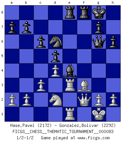 Last move : 1/2-1/2 2009 November 9 15:20:28 [Event "FICGS__CHESS__THEMATIC_TOURNAMENT__000083"] [Site "FICGS"] [Date "2009.06.14"] [Round "1"] [White "Hase,Pavel"] [Black "Gonzalez,Bolivar"] [Result "1/2-1/2"] [WhiteElo "2172"] [BlackElo "2292"] 1.e4 e5 2.f4 exf4 3.Bc4 Nc6 4.d4 Nf6 5.e5 d5 6.Be2 Ne4 7.Bxf4 f6 8.Nf3 fxe5 9.Nxe5 Nxe5 10.Bxe5 Bb4+ 11.c3 O-O 12.Bf3 Bd6 13.Bxd6 Nxd6 14.O-O c6 15.Nd2 Qg5 16.Qe2 Bf5 17.Rae1 Rae8 18.Qf2 Be4 19.Re2 h6 20.Rfe1 Qg6 21.Re3 1/2-1/2 KGA : Bishop's gambit, Maurian defense Kingside Castling by player Black (move 11) Kingside Castling by player White (move 14) This chess game ended in a draw. Follow this game move after move (download)What would Chess be without silly mistakes ? (Kurt Richter) Es hat in meinem Leben Zeiten gegeben, da ich sehr nahe daran war zu glauben, daß ich auch nicht eine einzige Schachpartie verlieren könnte. (José Raúl Capablanca) Existen dos clases de sacrificios: los correctos y los míos. (Mikhail Tal) Le joueur d'Echecs qui veut atteindre le top est obligé de développer son propre credo créatif. Alexeï Stepanovicth Souétine. Il est facile d'écrire des livres ! Ce qui est difficile, c'est de jouer ! (Alexeï Stepanovicth Souétine) I live to kill Traxler counterattack. (Ilmars Cirulis)