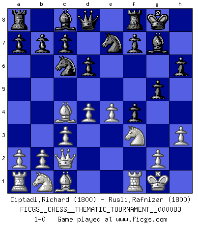 Last move : 1-0 2009 July 25 2:56:24 [Event "FICGS__CHESS__THEMATIC_TOURNAMENT__000083"] [Site "FICGS"] [Date "2009.06.14"] [Round "1"] [White "Ciptadi,Richard"] [Black "Rusli,Rafnizar"] [Result "1-0"] [WhiteElo "1800"] [BlackElo "1800"] 1.e4 e5 2.f4 exf4 3.d4 g5 4.Nf3 d6 5.h3 Bg7 6.Bc4 Nc6 7.c3 h6 8.O-O Nge7 9.Qb3 O-O 10.Qc2 1-0 KGA : Villemson (Steinitz) gambit Kingside Castling by player White (move 8) Kingside Castling by player Black (move 9) Player White won this chess game. Follow this game move after move (download)I prefer to lose a really good game than to win a bad one. (David Levy) Taktik ist was man tun muß, wenn etwas zu tun ist. Strategie ist was man tun muß, wenn nichts zu tun ist. (Savielly Grigorievitsch Tartakower) Tu cuerpo tiene que estar en óptima condición. Tu Ajedrez se deteriora como lo hace tu cuerpo. No puedes separar la mente y el cuerpo. (Bobby Fischer) Nous vivons dans un monde échiquéen : chaque jour qui passe est un défi à relever. (Philosophe Sasha) Good decisions come from experience, and experience comes from bad decisions. (Anonymous)