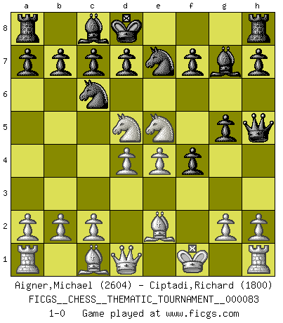 Last move : 1-0 2009 August 3 0:8:30 [Event "FICGS__CHESS__THEMATIC_TOURNAMENT__000083"] [Site "FICGS"] [Date "2009.06.14"] [Round "1"] [White "Aigner,Michael"] [Black "Ciptadi,Richard"] [Result "1-0"] [WhiteElo "2604"] [BlackElo "1800"] 1.e4 e5 2.f4 exf4 3.Bc4 Qh4+ 4.Kf1 Nc6 5.Nf3 Qh5 6.d4 g5 7.Nc3 Bg7 8.Nd5 Kd8 9.Be2 Nge7 10.Ne5 1-0 This chess game has been lost on time (started : 2009.06.14 13:53:51) KGA : Bishop's gambit, Boden defense Player White won this chess game. Follow this game move after move (download)Alekhine is a poet who creates a work of art out of something that would hardly inspire another man to send home a picture post card. (Max Euwe) Wenn ich mich einlogge, glauben die Leute gewöhnlich nicht, dass ich es selbst bin und sie fangen an, mir dumme Fragen zu stellen. Und wenn sie es glauben, stellen sie wieder andere dumme Fragen. (Judith Polgar) Si el ingenio solamente fuese necesario para lucirse, las mujeres serían las mejores jugadoras de Ajedrez del mundo. (Albin) Seul un grand joueur sait à quel point il joue faiblement. (Xavier Tartacover) He who is a good ruler must first have been ruled. (Aristotle)