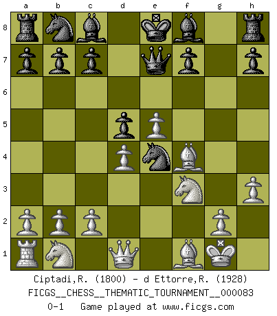 Last move : 0-1 2009 September 11 22:1:5 [Event "FICGS__CHESS__THEMATIC_TOURNAMENT__000083"] [Site "FICGS"] [Date "2009.06.14"] [Round "1"] [White "Ciptadi,Richard"] [Black "d Ettorre,Rodolfo"] [Result "0-1"] [WhiteElo "1800"] [BlackElo "1928"] 1.e4 e5 2.f4 exf4 3.d4 Qh4+ 4.Ke2 d5 5.Nf3 Qe7 6.e5 g5 7.h3 Nf6 8.Nxg5 Nh5 9.Nf3 Ng3+ 10.Kf2 Nxh1+ 11.Kg1 Ng3 12.Bxf4 Ne4 0-1 This chess game has been lost on time (started : 2009.06.14 13:53:51) KGA : Villemson (Steinitz) gambit Player Black won this chess game. Follow this game move after move (download)Chess is no whit inferior to the violin, and we have a large number of professional violinists. (Mikhail Botvinnik) Wie gewinnt Tal? Er entwickelt alle seine Figuren in die Brettmitte und opfert sie dann irgendwo. (Robert James Fischer) No volvere nunca a jugar contigo. Has insultado a mi amigo. - cuando un oponente se maldijo por una mala jugada (Miguel Najdorf) Celui qui prend des risques peut perdre, celui qui n'en prend pas perd toujours. (Xavier Tartacover) It is a good thing for an uneducated man to read books of quotations. (Winston Churchill)