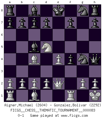 Last move : 0-1 2009 September 13 13:17:59 [Event "FICGS__CHESS__THEMATIC_TOURNAMENT__000083"] [Site "FICGS"] [Date "2009.06.14"] [Round "1"] [White "Aigner,Michael"] [Black "Gonzalez,Bolivar"] [Result "0-1"] [WhiteElo "2604"] [BlackElo "2292"] 1.e4 e5 2.f4 exf4 3.Bc4 Nc6 4.Nf3 g5 5.Nc3 g4 6.O-O gxf3 7.Qxf3 Bc5+ 8.Kh1 Qh4 9.Nd5 Ne5 10.Qe2 Ng4 0-1 KGA : Bishop's gambit, Maurian defense Kingside Castling by player White (move 6) Player Black won this chess game. Follow this game move after move (download)The defensive power of a pinned piece is only imaginary. (Aaron Nimzovich) Ich bin Weltmeister und muß mit niemandem irgend etwas diskutieren. (Viswanathan Anand) El Ajedrez es un terrible juego. Si no controlas el centro, tu oponente tiene una posición mas holgada. Si tienes control del centro, ¡entonces realmente tu tienes algo de que preocuparte!. (Siegbert Tarrasch) Les sacrifices démontrent seulement que quelqu'un a gaffé. (Savielly Tartacover) The greatest con, that he ever pulled... was making you believe... that he is you. (Revolver, movie)