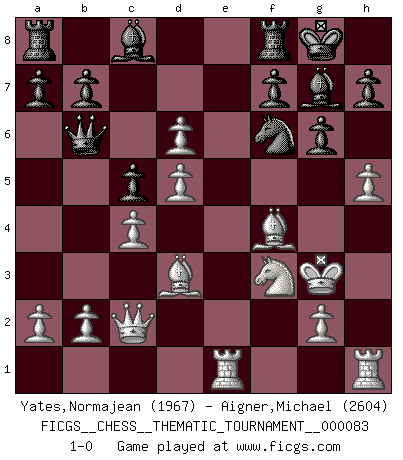 Last move : 1-0 2009 August 14 19:27:49 [Event "FICGS__CHESS__THEMATIC_TOURNAMENT__000083"] [Site "FICGS"] [Date "2009.06.14"] [Round "1"] [White "Yates,Normajean"] [Black "Aigner,Michael"] [Result "1-0"] [WhiteElo "1967"] [BlackElo "2604"] 1.e4 e5 2.f4 Qf6 3.Nc3 exf4 4.Nf3 Ne7 5.e5 Qe6 6.d4 Nd5 7.Nxd5 Qxd5 8.Kf2 c5 9.c4 Qe6 10.d5 Qg6 11.Bxf4 Qb6 12.Qc2 g6 13.h4 Bg7 14.h5 O-O 15.Re1 d6 16.exd6 Nd7 17.Bd3 Nf6 18.Kg3 1-0 KGD : Norwalde variation Kingside Castling by player Black (move 14) Player White won this chess game. Follow this game move after move (download)Only sissies Castle. (Rob Sillars) Du weisst es gibt ein Problem mit Computern und Fernschach, wenn jeder eine Rating von 2450 hat. (John Christen Knudsen) Aquel que teme a un Peón de Reina aislado, debería de retirarse del Ajedrez. (Siegbert Tarrasch) Il n'y a plus de joueurs du niveau de Jacob Murray dont la seule quête est le beau jeu, le plaisir de voir les pièces construire quelque chose. Sur 10 idées à la minute, 9 seront sans intérêt, la dernière s'avèrera géniale. (Christian Bauer) Hold em is to stud what chess is to checkers. (Johnny Moss)
