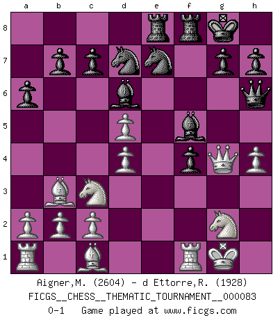 Last move : 0-1 2009 August 20 21:48:28 [Event "FICGS__CHESS__THEMATIC_TOURNAMENT__000083"] [Site "FICGS"] [Date "2009.06.14"] [Round "1"] [White "Aigner,Michael"] [Black "d Ettorre,Rodolfo"] [Result "0-1"] [WhiteElo "2604"] [BlackElo "1928"] 1.e4 e5 2.f4 exf4 3.Bc4 d5 4.exd5 Qh4+ 5.Kf1 Bd6 6.Nf3 Qh6 7.Nc3 Ne7 8.d4 O-O 9.Kf2 Bg4 10.h3 Bh5 11.Rf1 Nd7 12.Kg1 a6 13.Bb3 Rae8 14.g4 Bg6 15.h4 f6 16.Ne1 f5 17.Ng2 fxg4 18.Qxg4 Bf5 0-1 KGA : Bishop's gambit, Bledow variation Kingside Castling by player Black (move 8) Player Black won this chess game. Follow this game move after move (download)I like the moment when I break a man's ego. (Bobby Fischer) Der Partner hat auch seine Existenzberechtigung. (Savielly Grigorievitsch Tartakower) Juega la Apertura como un libro, el Juego Medio como un mago y los Finales como una máquina. (Spielmann) Je menace de comprendre la position. (Anonyme) The best weapon against an enemy is another enemy. (Friedrich Nietzsche)