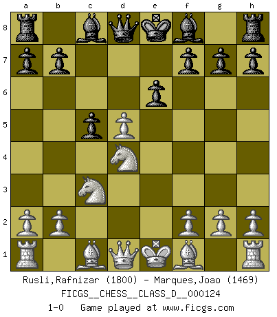 Last move : 1-0 2009 June 26 21:44:57 [Event "FICGS__CHESS__CLASS_D__000124"] [Site "FICGS"] [Date "2009.06.14"] [Round "1"] [White "Rusli,Rafnizar"] [Black "Marques,Joao"] [Result "1-0"] [WhiteElo "1800"] [BlackElo "1469"] 1.d4 Nf6 2.c4 e6 3.Nf3 d5 4.Nc3 c5 5.cxd5 Nxd5 6.e4 Nc6 7.exd5 Nxd4 8.Nxd4 1-0 Queen's pawn game Player White won this chess game. Follow this game move after move (download)The passed Pawn is a criminal, who should be kept under lock and key. Mild measures, such as police surveillance, are not sufficient. (Aaron Nimzovich) Kleine Schachspieler machen Mist, und große Schachspieler machen Mist, aber große machen weniger Mist. (Fritz Sämisch) El Ajedrez es 99 por ciento táctica. (Teichmann) Le jeu d'échecs est comme rejeté hors du temps. (Antoine de Saint-Exupéry) For to win one hundred victories in one hundred battles is not the acme of skill. To subdue the enemy without fighting is the acme of skill. (Sun Tzu)