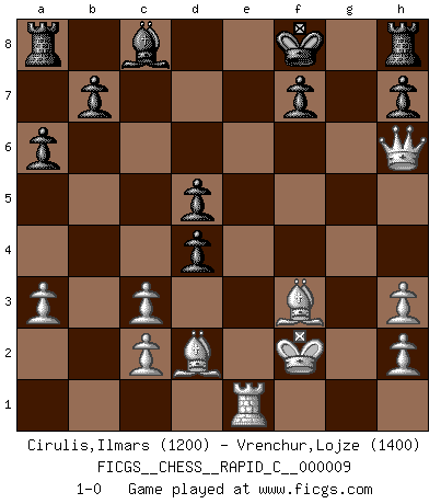 Last move : 1-0 2006 September 18 12:55:28 [Event "FICGS__CHESS__RAPID_C__000009"] [Site "FICGS"] [Date "2006.09.13"] [Round "1"] [White "Cirulis,Ilmars"] [Black "Vrenchur,Lojze"] [Result "1-0"] [WhiteElo "1200"] [BlackElo "1400"] 1.e4 e5 2.Nf3 Nc6 3.Nc3 a6 4.d4 exd4 5.Nxd4 Qf6 6.Be3 Bb4 7.a3 Bxc3+ 8.bxc3 Ne5 9.f4 Ng6 10.e5 Nxe5 11.fxe5 Qxe5 12.Qd3 Nf6 13.Be2 Nd5 14.Bd2 Nf4 15.Qg3 g5 16.Kf2 d5 17.Bf3 c5 18.Rae1 Nh3+ 19.gxh3 Qxe1+ 20.Rxe1+ Kf8 21.Qxg5 cxd4 22.Qh6 1-0 Three knights game Player White won this chess game. Follow this game move after move (download)Pawn endings are to Chess what putting is to golf. (Cecil Purdy) Lisa Lane, amerikanische Schachmeisterin, hatte Fischer einmal als stärksten lebenden Spieler bezeichnet. Antwort: Das ist richtig, aber Lisa Lane ist eigentlich nicht in der Lage, das zu beurteilen. (Robert James Fischer) Un entendimiento a fondo de las continuaciones típicas del mate, hace de las combinaciones de sacrificio mas complicadas conducirlas a ellas no solo sin dificultad, sino casi de una manera natural. (Siegbert Tarrasch) Je ne crois pas en la psychologie, je crois aux bons coups. (Robert Fischer) No, I am still playing. (Anatoly Karpov)