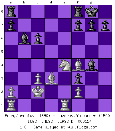 Last move : 1-0 2009 December 17 7:49:0 [Event "FICGS__CHESS__CLASS_D__000124"] [Site "FICGS"] [Date "2009.06.14"] [Round "1"] [White "Pech,Jaroslav"] [Black "Lazarov,Alexander"] [Result "1-0"] [WhiteElo "1590"] [BlackElo "1540"] 1.e4 c5 2.c3 d5 3.exd5 Qxd5 4.d4 Nf6 5.Nf3 Bg4 6.dxc5 Qxd1+ 7.Kxd1 e5 8.b4 e4 9.h3 Bh5 10.g4 Nxg4 11.hxg4 Bxg4 12.Nbd2 exf3 13.Bd3 Nc6 14.Re1+ Be7 15.Kc2 O-O 16.b5 Bxc5 17.bxc6 bxc6 18.Ne4 Bb6 19.Bf4 1-0 This chess game has been lost on time (started : 2009.06.14 19:25:13) Sicilian : Alapin's variation (2.c3) Kingside Castling by player Black (move 15) Player White won this chess game. Follow this game move after move (download)Nothing excites jaded Grandmasters more than a theoretical novelty. (Dominic Lawson) Wer wird heute Abend ihr Gegner sein? -- Heute Abend spiele ich gegen die schwarzen Steine. (Akiba Rubinstein) El Ajedrez es como la guerra en un tablero. (Bobby Fischer) Assurément je connaissais par expérience le mystérieux attrait de ce jeu royal, le seul entre tous les jeux inventés par les hommes qui échappe souverainement à la tyrannie du hasard, le seul où l'on ne doive sa victoire qu'à son intelligence ou plutôt à une certaine forme d'intelligence. Mais n'est-ce pas déjà le limiter injurieusement que d'appeler les échecs un jeu ? N'est-ce pas une science, un art ou quelque chose qui, comme le cercueil de Mahomet entre ciel et terre, est suspendu entre l'un et l'autre, et qui réunit un nombre incroyable de contraires ? [...] C'est une pensée qui ne mène à rien, une mathématique qui n'établit rien, un art qui ne laisse pas d'uvre, une architecture sans matière; et il l'a prouvé néanmoins qu'il était plus durable, à sa manière, que les livres ou que tout autre monument, ce jeu unique qui appartient à tous les peuples et à tous les temps, et dont personne ne sait quel dieu en fit don à la terre pour tuer l'ennui, pour aiguiser l'esprit et stimuler l'âme. Où commence-t-il, où finit-il ? (Stefan Zweig) Looking at the proliferation of personal web pages on the Net, it looks like very soon everyone on Earth will have 15 megabytes of fame. (M.G. Sriram)