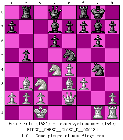 Last move : 1-0 2009 September 23 9:42:29 [Event "FICGS__CHESS__CLASS_D__000124"] [Site "FICGS"] [Date "2009.06.14"] [Round "1"] [White "Price,Eric"] [Black "Lazarov,Alexander"] [Result "1-0"] [WhiteElo "1631"] [BlackElo "1540"] 1.e4 c5 2.Nf3 d6 3.d4 cxd4 4.Nxd4 Nf6 5.Nc3 g6 6.Be3 Bg7 7.f3 Nc6 8.Qd2 O-O 9.Bc4 Bd7 10.O-O-O Rb8 11.g4 b5 12.Bb3 Ne5 13.Qe2 Nfxg4 14.Rdg1 1-0 This chess game has been lost on time (started : 2009.06.14 19:25:13) Sicilian : Dragon, Yugoslav attack Kingside Castling by player Black (move 8) Queenside Castling by player White (move 10) Player White won this chess game. Follow this game move after move (download)I know people who have all the will in the world, but still can't play good Chess. (Bobby Fischer) Es war undenkbar für die Behörden, dass ein sowjetischer Großmeister auf diese Art und Weise [Fischer-Taimanov 6:0] verliert, ohne dass es eine politischer Erklärung dafür gäbe. (Mark Taimanov) A la fecha, Fischer esta simplemente un nivel arriba de todos los mejores jugadores de Ajedrez del mundo. (John Jacobs) Lorsque vous vous retrouvez devant une position atroce, ne tendez pas un ultime piège dérisoire avec l'intention d'abandonner si l'adversaire le déjoue ! Faites-vous plutôt un devoir de résister comme si votre vie en dépendait. Jouez le coup qui vous déplairait au centuple si vous étiez dans la peau de votre tortionnaire ! Have no fear of perfection - you'll never reach it. (Salvador Dali)