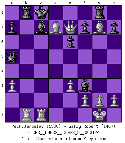 Last move : 1-0 2009 November 7 20:29:11 [Event "FICGS__CHESS__CLASS_D__000124"] [Site "FICGS"] [Date "2009.06.14"] [Round "1"] [White "Pech,Jaroslav"] [Black "Gally,Robert"] [Result "1-0"] [WhiteElo "1590"] [BlackElo "1467"] 1.d4 Nf6 2.c4 e6 3.Nc3 Bb4 4.e3 d5 5.Nf3 c5 6.Bd3 Nc6 7.O-O Ng4 8.a3 cxd4 9.cxd5 dxc3 10.dxc6 cxb2 11.Bxb2 Bd6 12.cxb7 Bxb7 13.Qa4+ Ke7 14.Qxg4 Rg8 15.Rab1 Qa5 16.Bxg7 Rab8 17.Qh4+ Kd7 18.Bb5+ Kc8 19.Rfc1+ Bc7 20.Qe7 Bxf3 21.Bd7+ 1-0 Nimzo-Indian : 4.e3 Kingside Castling by player White (move 7) Player White won this chess game. Follow this game move after move (download)First-class players lose to second-class players because second-class players sometimes play a first-class game. (Siegbert Tarrasch) Jede Eröffnung ist gut genug um gespielt zu werden, wenn nur ihr Ruf schlecht genug ist. (Savielly Grigorievitsch Tartakower) Del Ajedrez se ha dicho que la vida no es lo suficientemente larga para él, pero eso es culpa de la vida, no del Ajedrez. (William Ewart Napier) Les Echecs, c'est l'art de la guerre sans les charniers, c'est la résurrection des morts tombés au champ d'honneur, l'espoir perpétuel, la suprématie de l'intelligence sur la force, la culture de l'esprit. (F. Szpiner) At work, the authority of a person is inversely proportional to the number of pens that person is carrying. (Dan Rotaru)